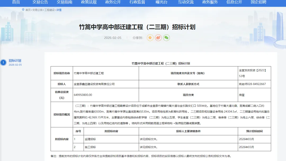 2026 年 2 月 5 日,成都市公共资源交易平台公布了竹篙中学高中部迁建工程(二三期)招标计划。招标人为金堂县鑫垚建设投资有限责任公司。