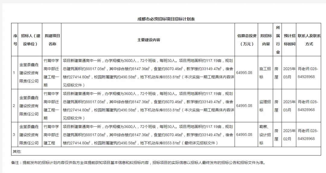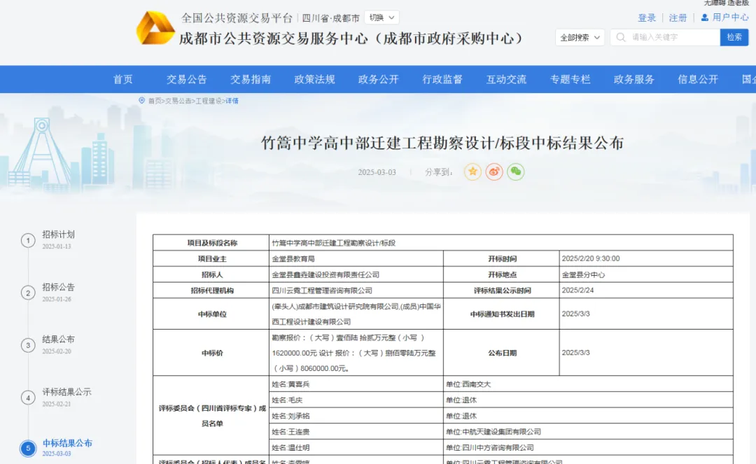 此前,于2025 年 3 月 3 日,成都市公共资源交易平台就公布了金堂竹篙中学高中部迁建工程(一期)的勘察设计 / 标段中标结果。