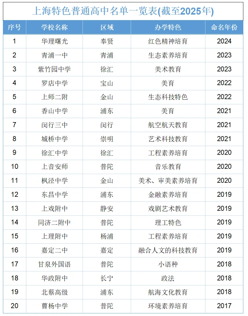 在上海,目前公布的20所特色普通高中名单,涵盖多个区域,办学特色多样化👇