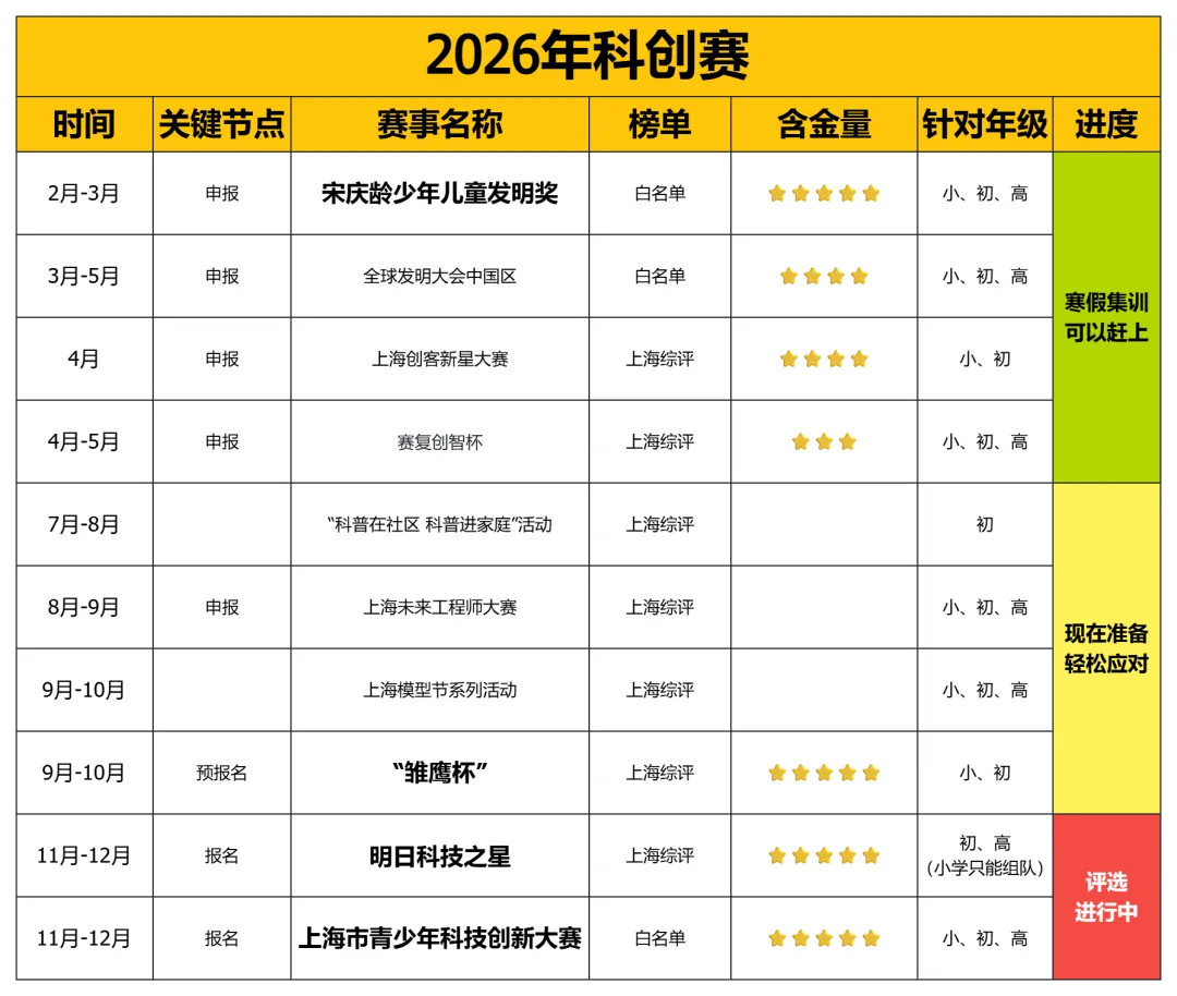 参照当前时间线进度,3月开学后我们有三大赛事陆续开展,分别是宋庆龄发明奖、全球发明大会、创客新星。这几项是上半年最具影响力的赛事集群,含金量高、影响力广。需要密切留意学校和官网通知,注意不要错过和遗漏报名时间。