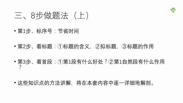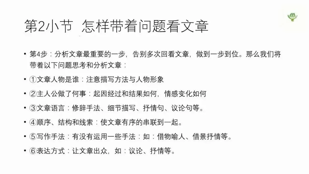 阅读能力的培养是小学语文素质教育重要的组成部分,也是语文考试中的拉分项目。只要掌握了答题思路和技巧,还是很容易拿到分数的。或许一些妈妈听完焦虑孩子没有做过专门的阅读训练,如果你家娃在做阅读题上“困难重重”,那么小编今天分享的这套《小学语文公式 从入门到满分》资源,妈妈们一定要好好带娃学习一下。这是一套教会家长和孩子在语文考试中,提高阅读题答题时间以及拿高分的视频教学课程。这套课程汇集8步做题法,7大题型,根据小学阅读题会考的知识点罗列起来总结出来40个答题公式。教会并且训练孩子怎么样带着问题看文章?怎么考就要怎么答题的方法。第一步:发现孩子阅读中可能会出现的问题,规划他们的答题模式。举个例子,一般小学语文考试中,娃会面临2~3篇的阅读理解,而如果想要娃能够得到高分,合理安排答题时间就很重要。这里妈妈们给娃设置一个时长,让娃在15分钟完成一篇文章的阅读+答题,12分钟最佳,而这个速度需要娃平时勤加多练才能提升上去哦~此外,“如何练习阅读”也是需要让娃们规范了解的一块,这里我们要重点注意丢分多的题型更要多练习,比如基础的看拼音写汉字和组词题、答题没思路、答题不规范等等。第二步:每节课都灌输一些关于阅读理解上的一个小技巧,帮助孩子准确又高效的答题。像是第一课“8步做题法”说到前三步“标序号、看标题、看首段”,虽然前三步和答题没有直接的关系,但是这些小方法能够帮娃节省答题时间,快速了解文章主旨和中心思想。当然啦,掌握了一些答题小技巧之后,还是有些地方需要孩子们重点观察学习。比方说8步做题法中的第4步,要求孩子每次在做题前思考一些问题,并且随着阅读,抓住文章中的一些关键信息,例如:人物、时间、地点、事件、写作手法、表达方式。前期的课题,娃们主要以理解为主,而进入更细的主题之后,专门应对阅读理解题目的万能公式就来啦,小本子抓紧记下来。如果碰上需要概括全文的题目,我们应该怎么样来回答呢?首先,宝宝们需要在文中找出中心句。根据不同的范围要求,孩子需要了解全文和局部的答题思路:还有根据不同的主题类型(记事类、写景类、状物类、童话寓言类),不同的文体对应不同的答题公式:上面小编举的概括类题目还只是阅读理解中的一类,这次的资源中还有非常多其他题型的指导讲解,包括:比如,文章的开头一般有起到首尾呼应、突出文章主旨的作用,可以通过首段文字快速抓住重点。比如,人物描写方式中,语言描写的公式离不开“人物状态+说话内容”,这也就是文章中给出的明线。再比如,写作手法是阅读理解中几乎回回必考的题型之一,娃在答题前需要有个严谨的思维顺序,再用公式完整的推理下来,答题间接明了,阅卷老师想挑错都没办法哈哈~~~课程的干货还有很多,共50节视频课,大家可以看看目录。免费领取完整电子版: