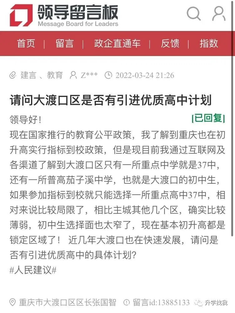 西瓜在重庆网络问政平台上看见一条建议,网友称, 大渡口初升高只有一所37中,能否引进优质高中?