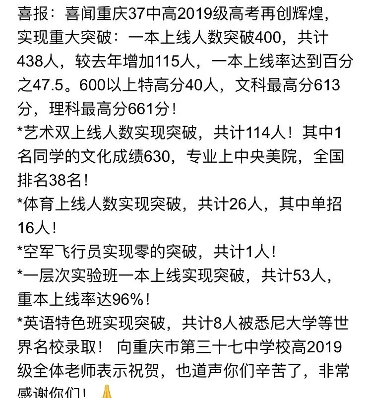 九年基础教育教学实力都得到了家长们的认可,西瓜也看到不少直属学校的学生都是从大渡口区考出去的。
