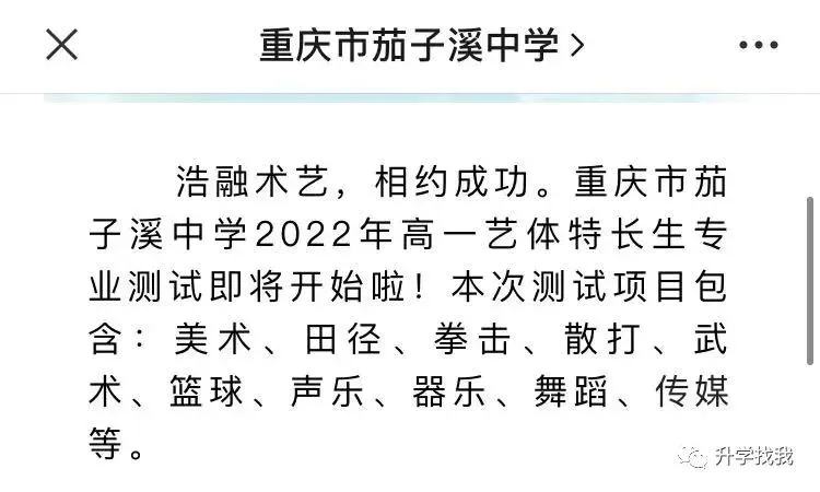 2022年茄子溪中学艺体特长生专业测试已经举行了,具体的招生项目有:美术、田径、拳击、散打……