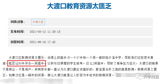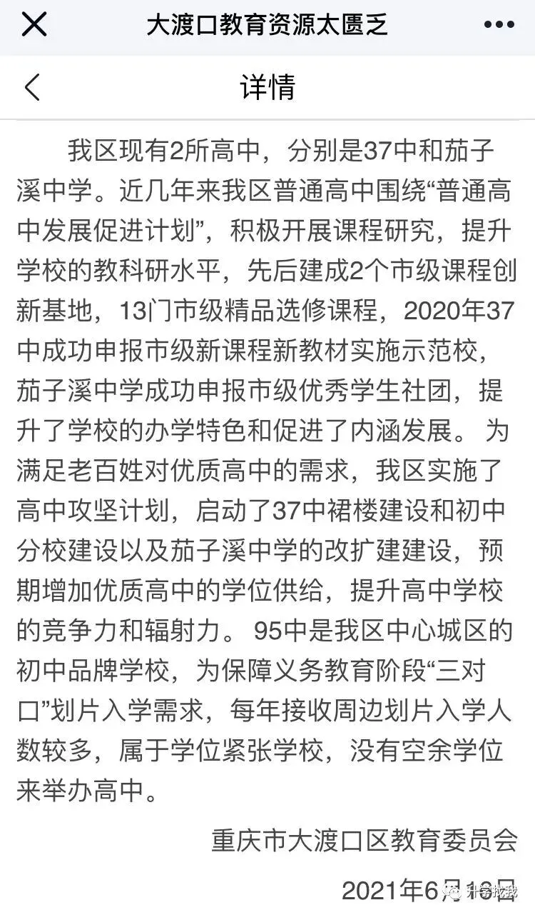 2021年6月16日,大渡口区教委答复,“95中属于学位紧张学校,暂时没有空余学位来举办高中”。这个回复,也打破了不少家长的幻想。