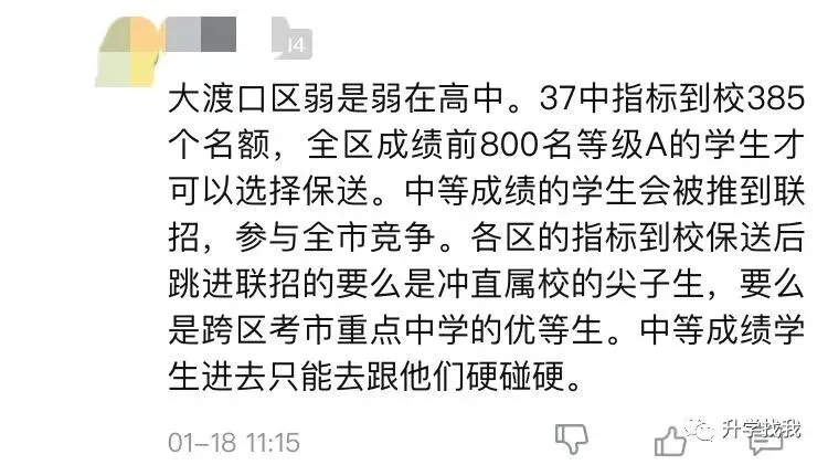 所以,在家长圈里,有人这样形容沙区和大渡口区的中学教育资源,如果沙区是一碗米的,那么大渡口就是半粒米的教育资源。虽然说法略显夸张,但是也能看出大家内心的看法。