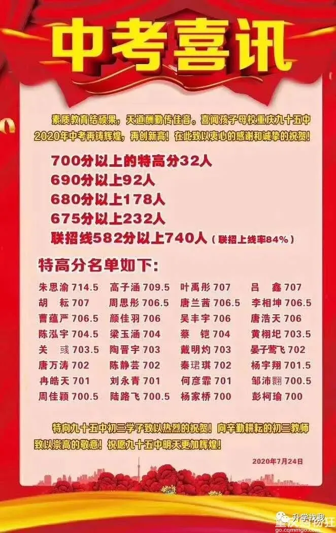 2020年的中考成绩,联招上线率84%,700分以上32人。
