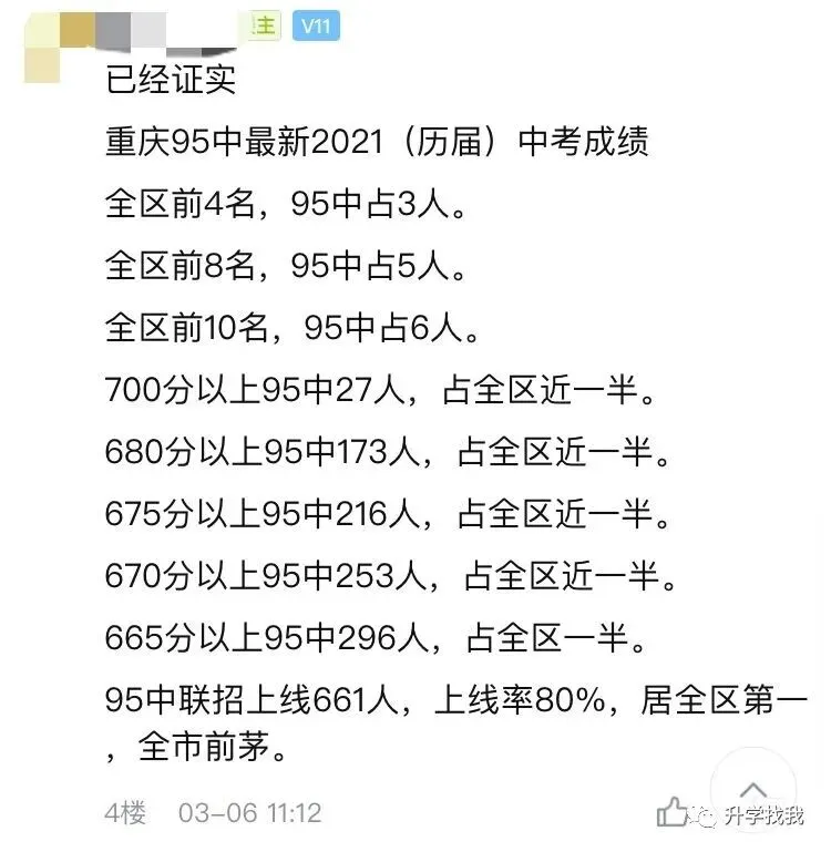 95中凭借着优秀的教学实力,得到家长们的认可。西瓜身边也有朋友,孩子在江北区读书,为了初中保底读95中,提前买了学校招生范围内的房子。