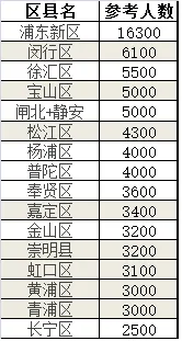 我们可以看到浦东新区的考生人数遥遥领先于其他区,是第二位——闵行区的2.67倍,是人数最少区的6.52倍!当然,这与浦东的地域面积是有关的。毕竟浦东是这几年发展最快,人流引入最大的区之一嘛。