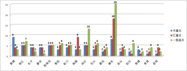 当然是那些考试人数少,但高中学校多的区。结合上面的数据,黄浦区大致3000多的考生,却坐拥了16所高中学校,而且其中9所还是市重点高中,4所示区重点。真是让人羡慕啊!