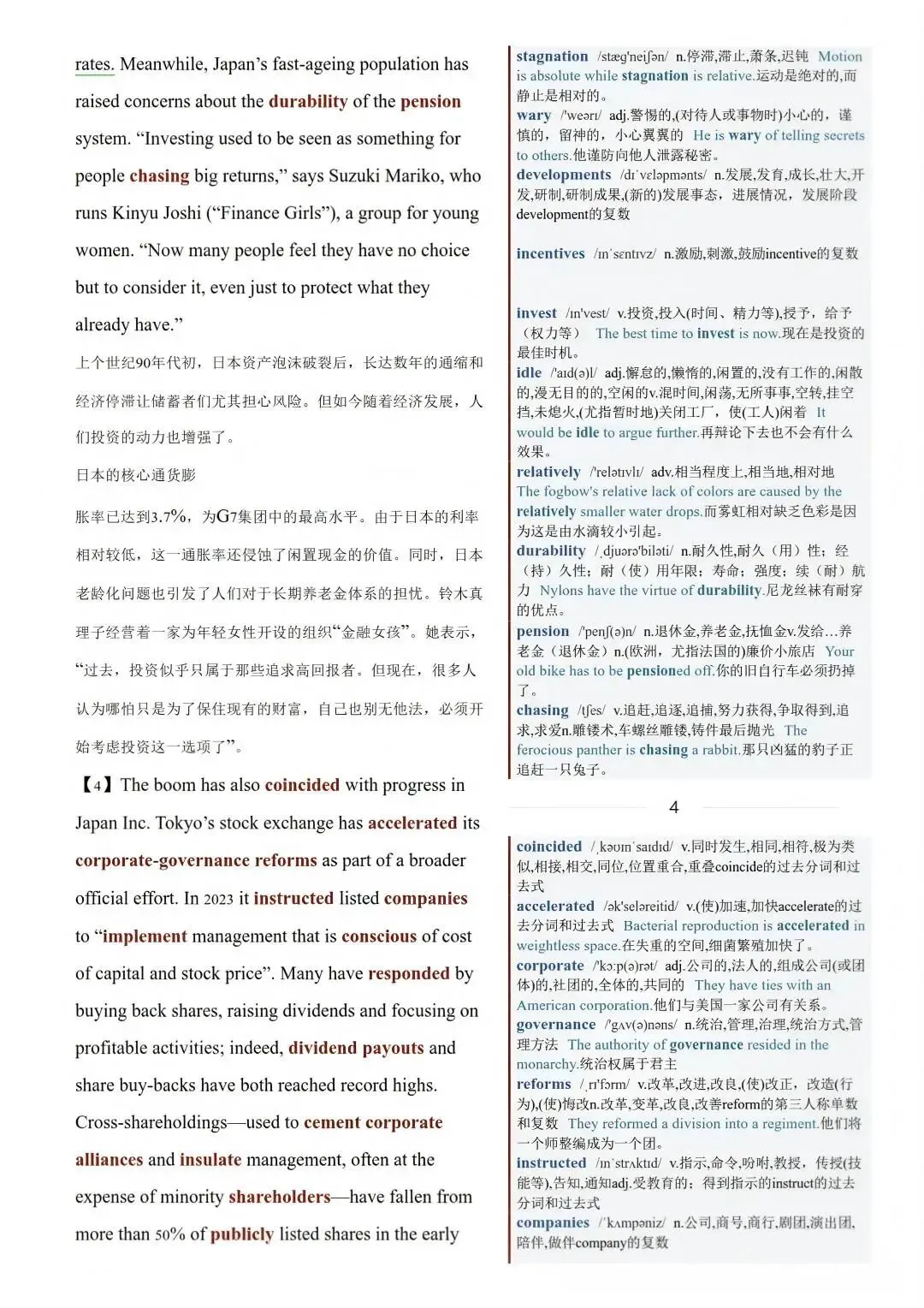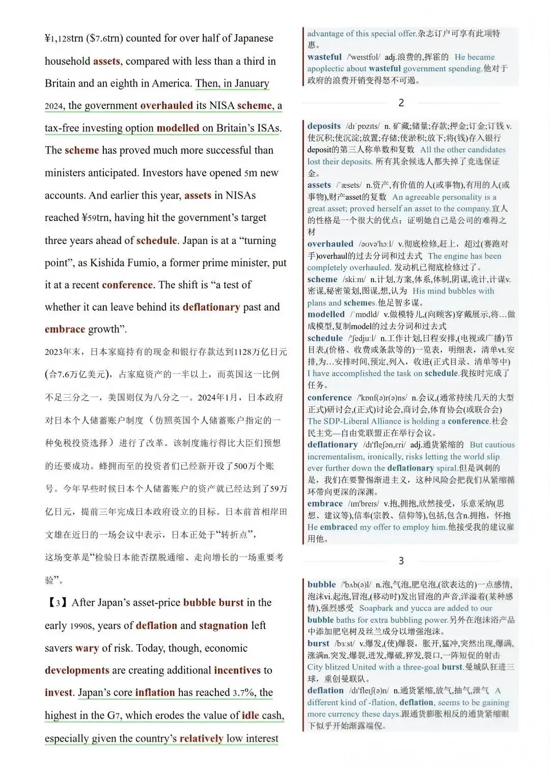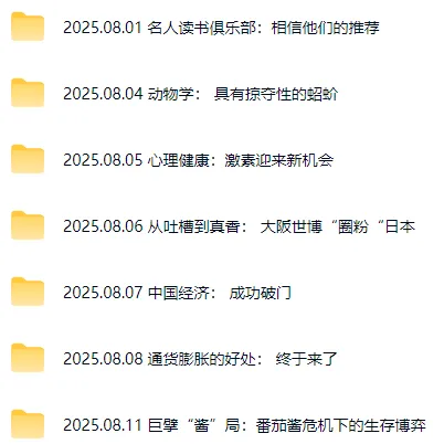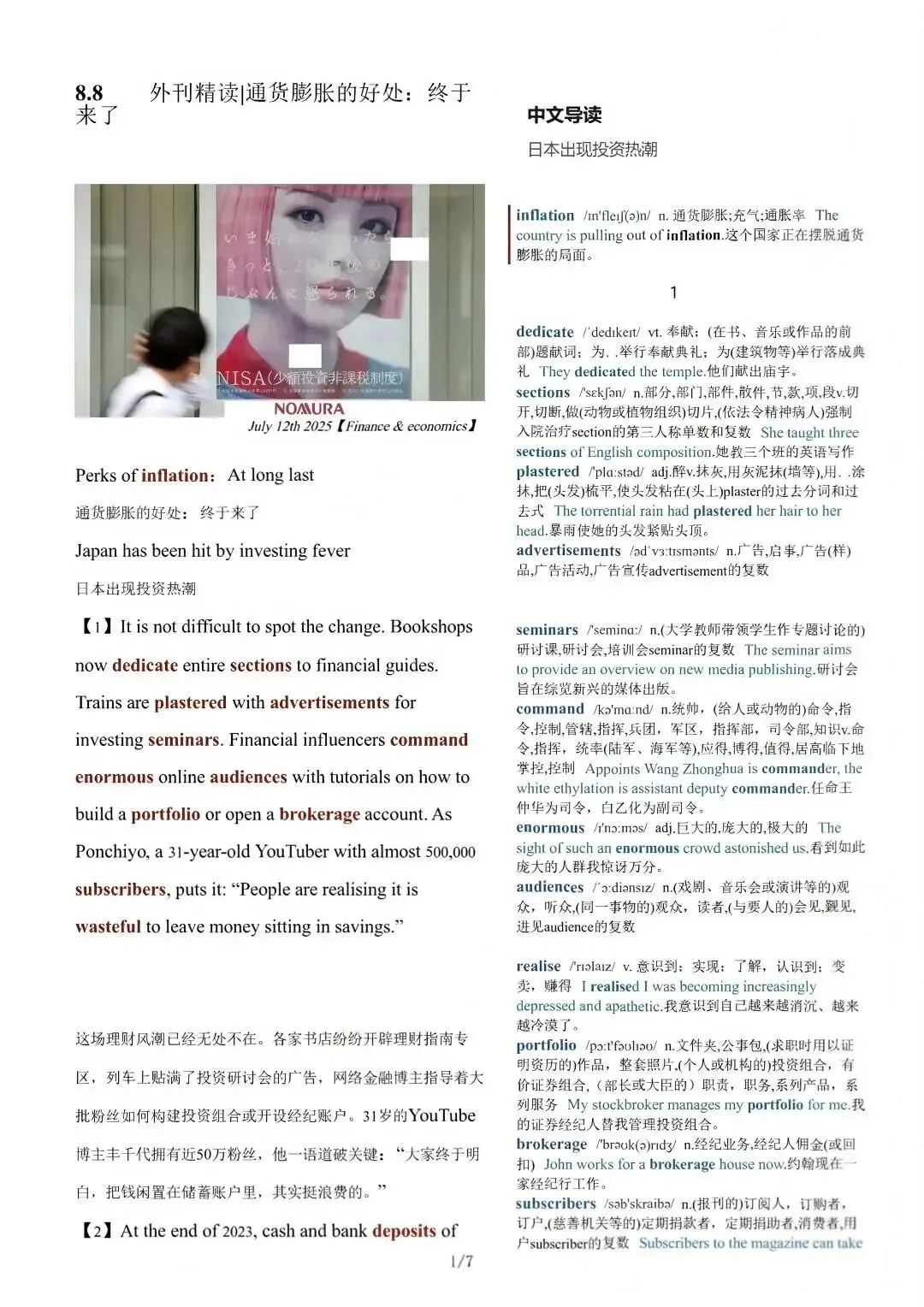 比如2025年8月8日一期,通货膨胀的好处:终于来了。内容含中英对照,重点词汇释义。
