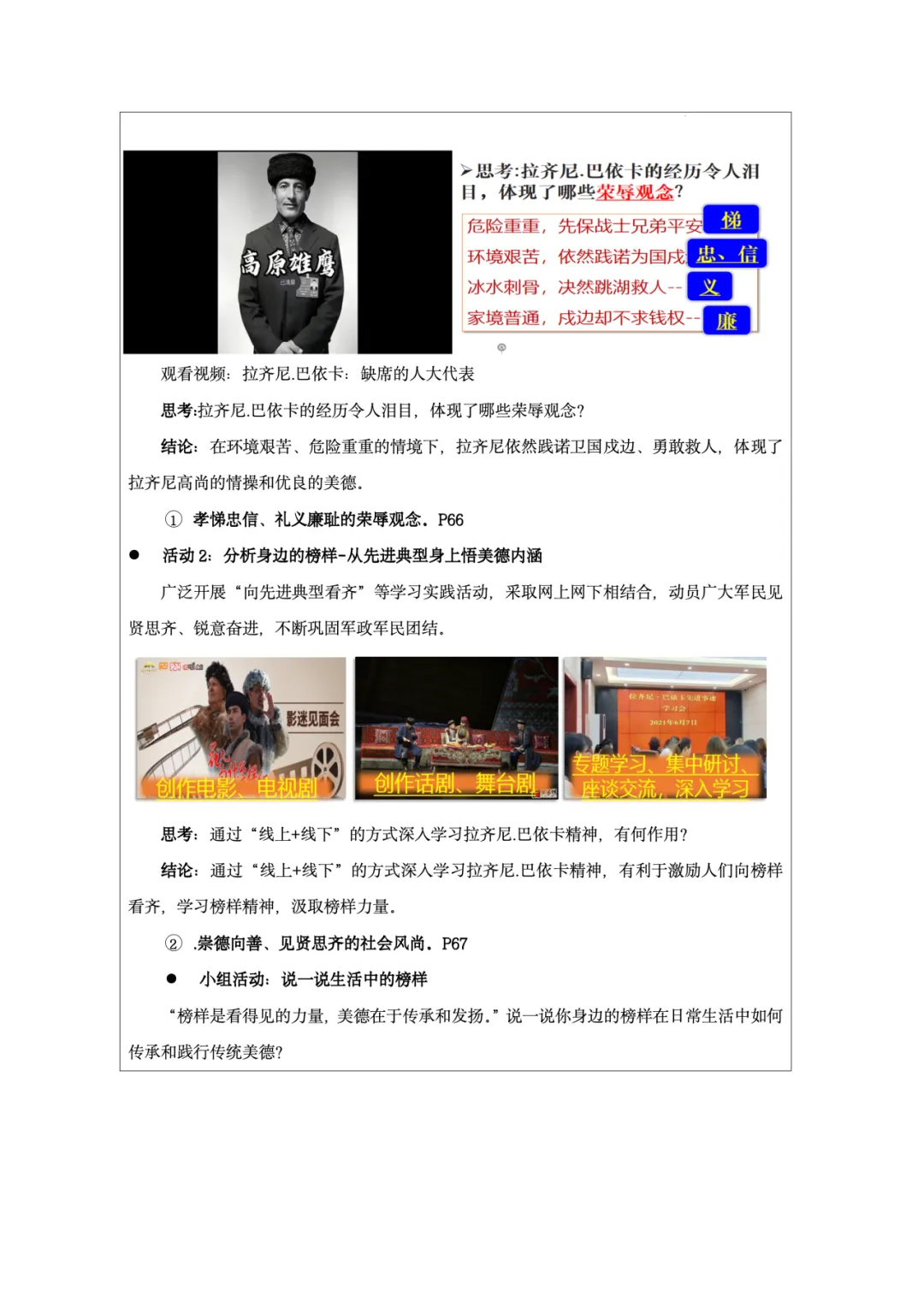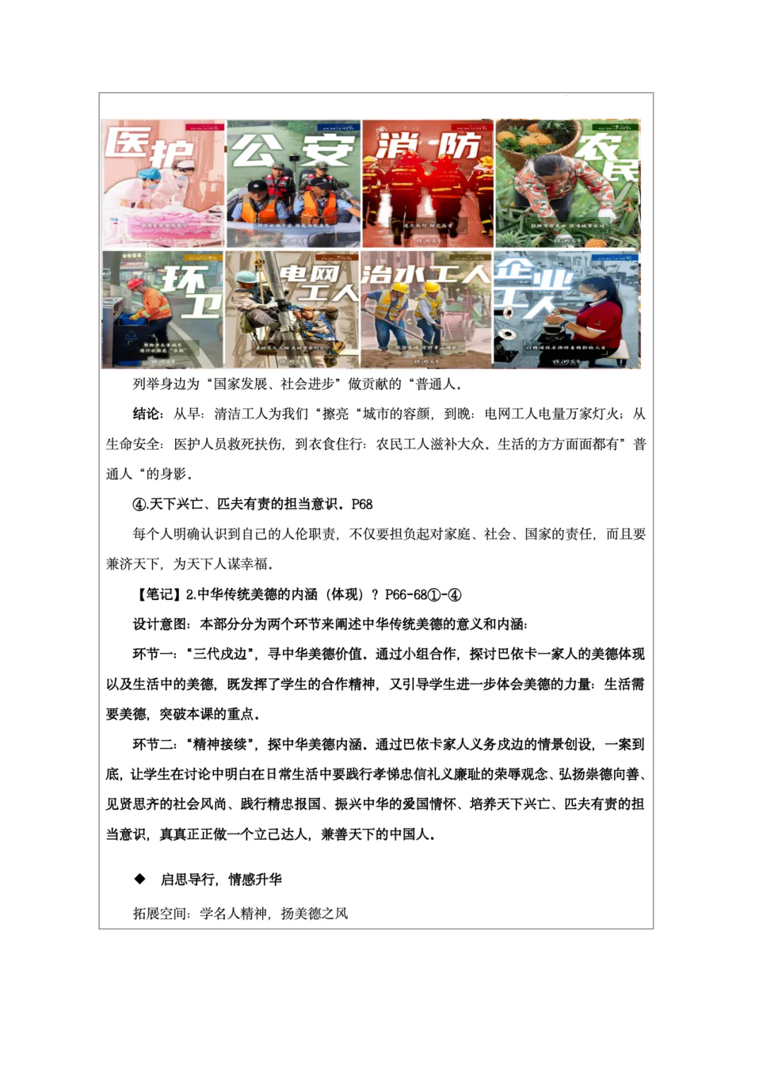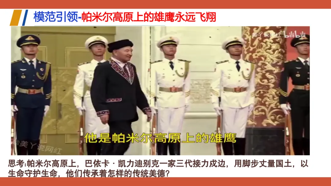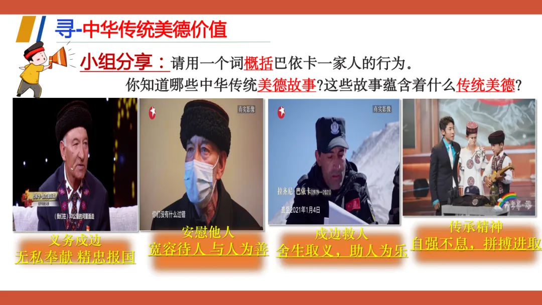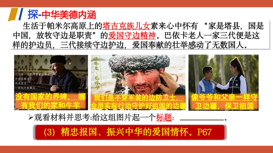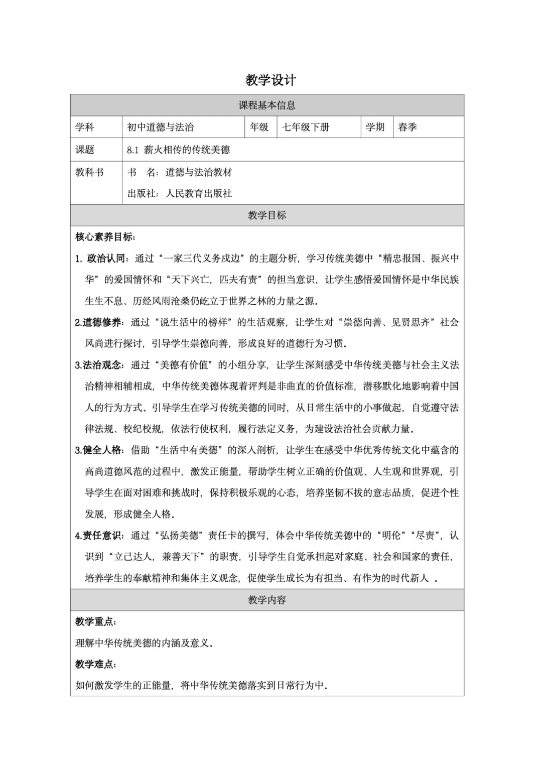 这份教学设计以新疆塔吉克族巴依卡一家三代戍边的真实故事为主线,将极具地域与民族特色的本土案例贯穿课堂,既贴近学生生活,又赋予传统美德鲜活的现实感。其次,本土资源与核心素养深度融合:通过“一家三代戍边”案例落实政治认同,通过“身边的榜样”讨论强化道德修养,通过撰写“责任卡”将榜样精神内化为学生的责任意识。再者,资源呈现方式多样,视频、图片、小组活动等形式生动展现了拉齐尼等榜样的事迹,增强了教学的感染力和思维深度。此外,教学设计还借助本土案例引导学生理解“孝悌忠信”“天下兴亡”等传统美德的时代价值,并将美德与法治观念相结合,使学生在真实情境中感悟传统美德的现实力量。总体而言,该设计以本土资源为载体,有效达成了核心素养目标,体现了贴近生活、知行合一的教学理念。