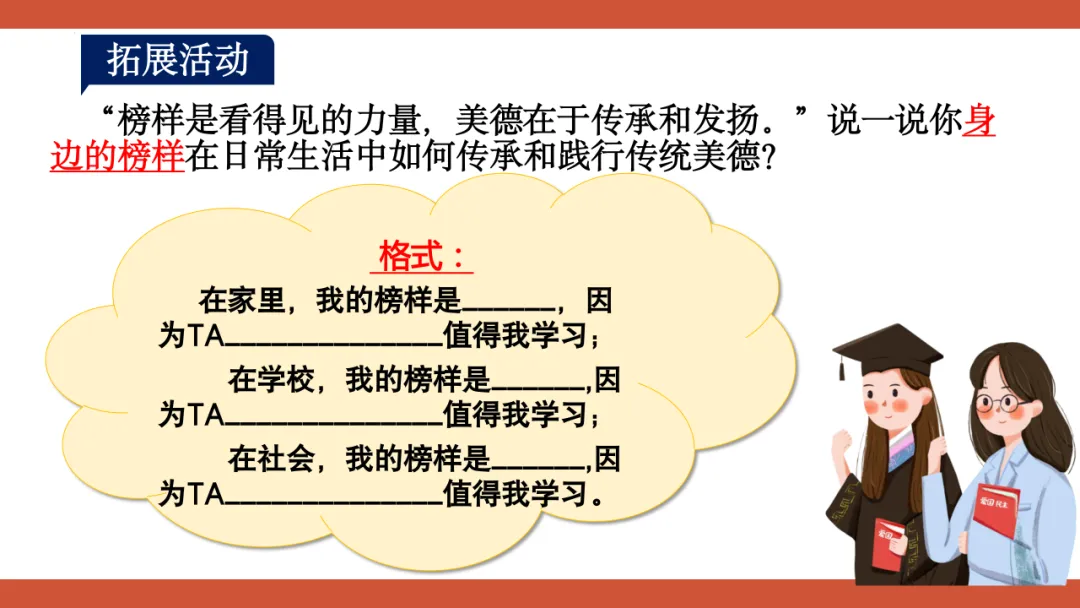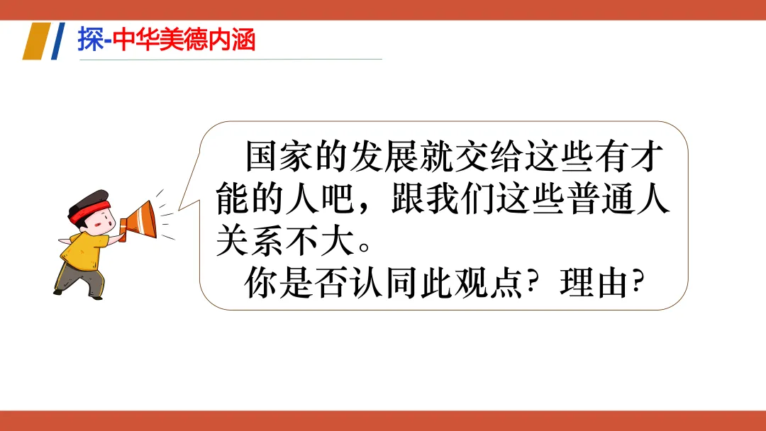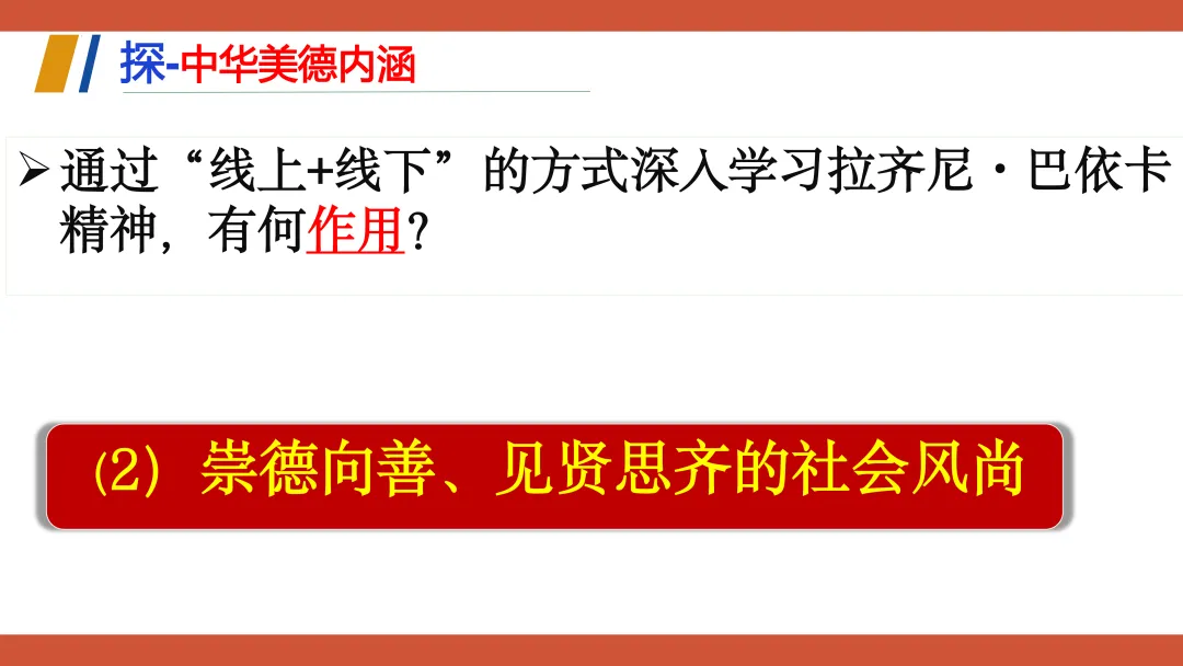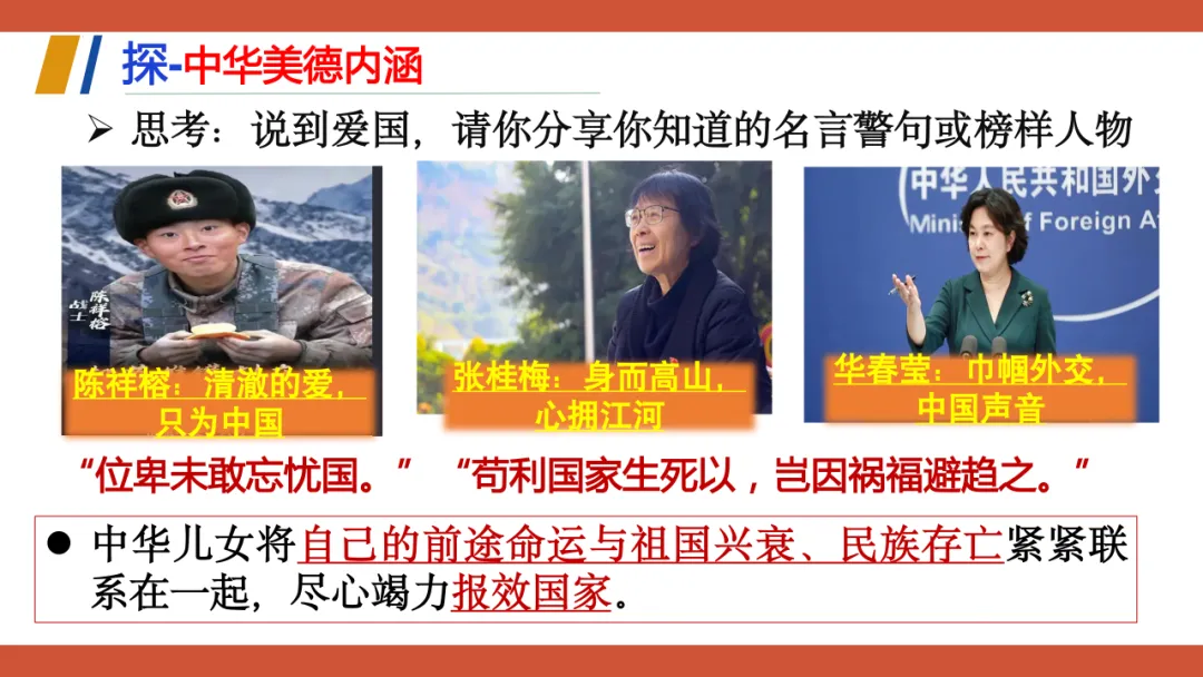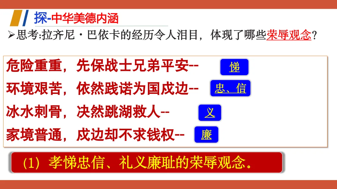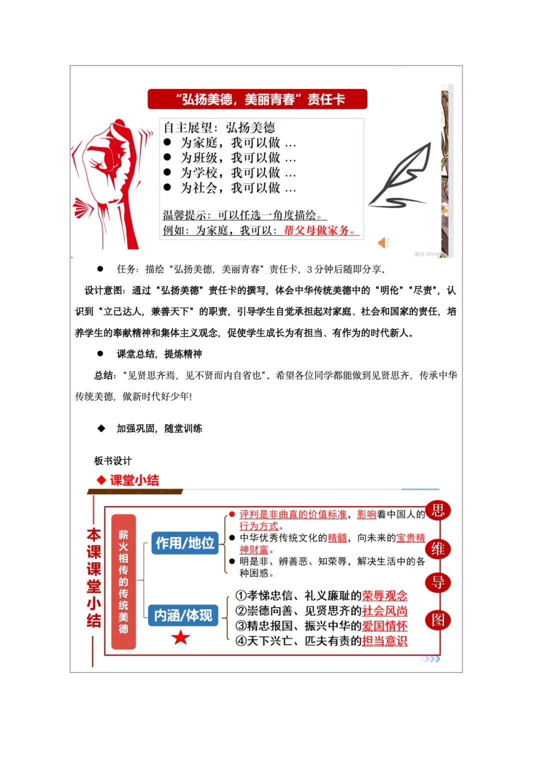 这份教学设计以新疆塔吉克族巴依卡一家三代戍边的真实故事为主线,将极具地域与民族特色的本土案例贯穿课堂,既贴近学生生活,又赋予传统美德鲜活的现实感。其次,本土资源与核心素养深度融合:通过“一家三代戍边”案例落实政治认同,通过“身边的榜样”讨论强化道德修养,通过撰写“责任卡”将榜样精神内化为学生的责任意识。再者,资源呈现方式多样,视频、图片、小组活动等形式生动展现了拉齐尼等榜样的事迹,增强了教学的感染力和思维深度。此外,教学设计还借助本土案例引导学生理解“孝悌忠信”“天下兴亡”等传统美德的时代价值,并将美德与法治观念相结合,使学生在真实情境中感悟传统美德的现实力量。总体而言,该设计以本土资源为载体,有效达成了核心素养目标,体现了贴近生活、知行合一的教学理念。