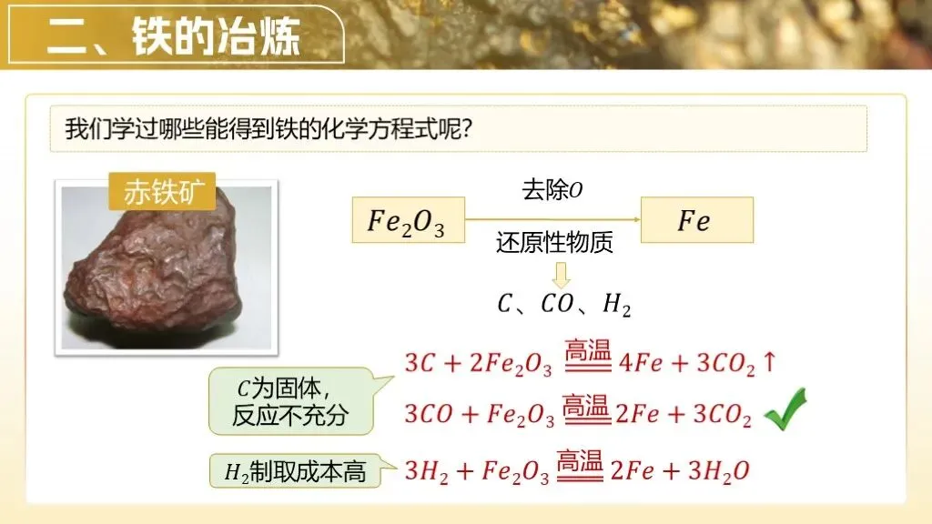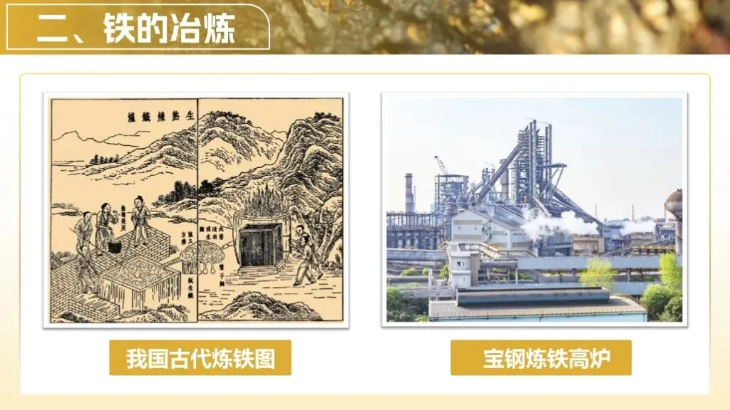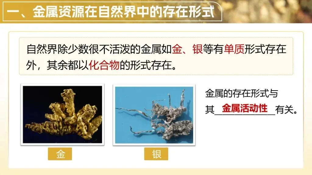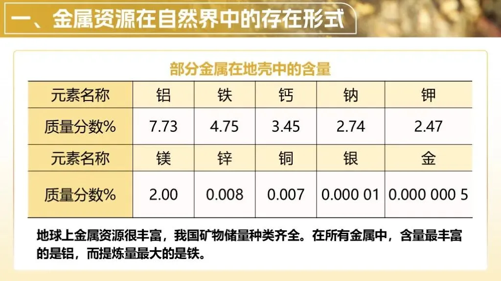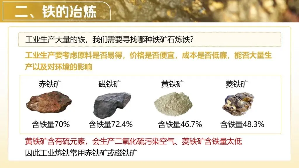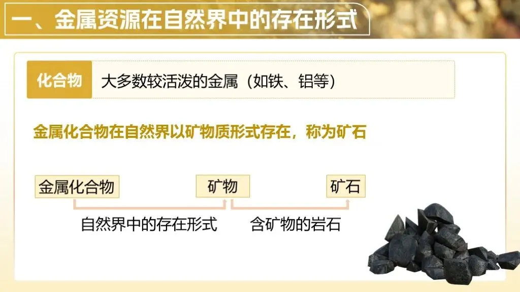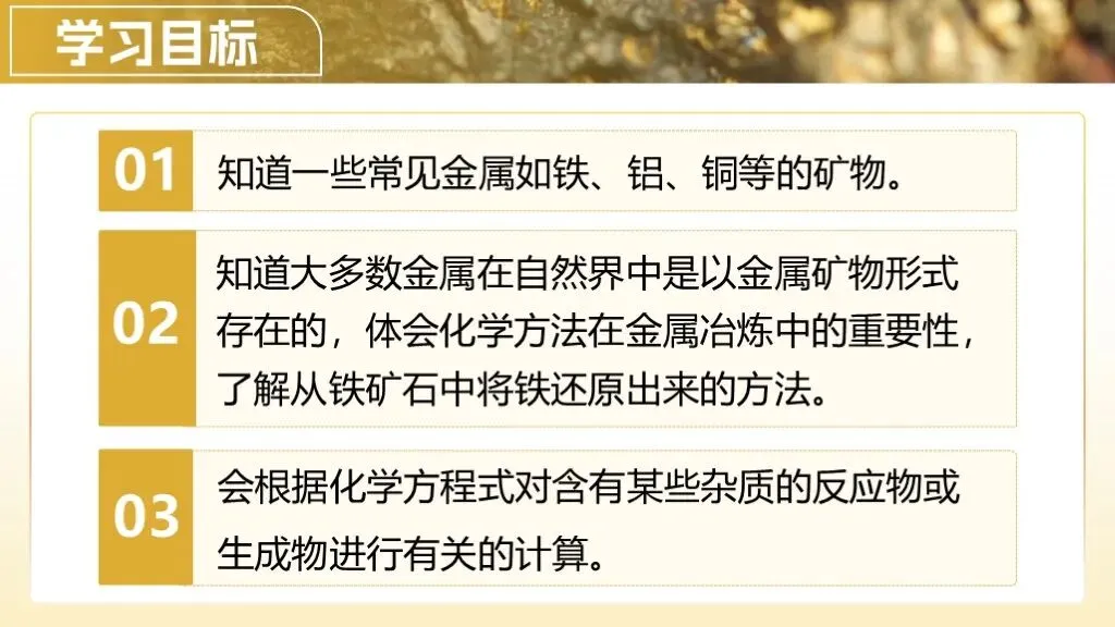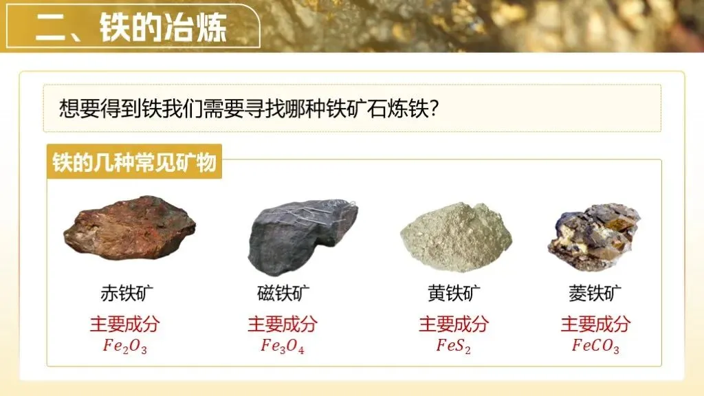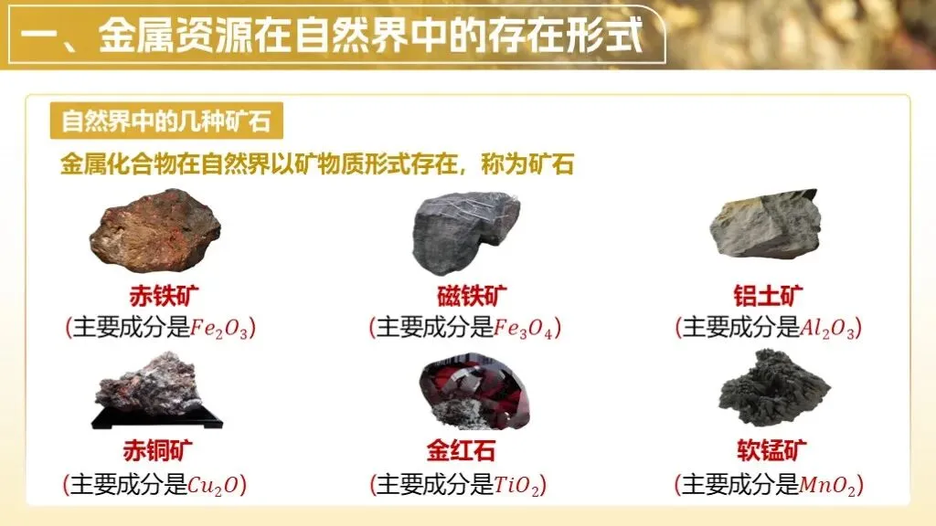 2.知道大多数金属在自然界中是以金属矿物形式存在的,体会化学方法在金属冶炼中的重要性,了解从铁矿石中将铁还原出来的方法。