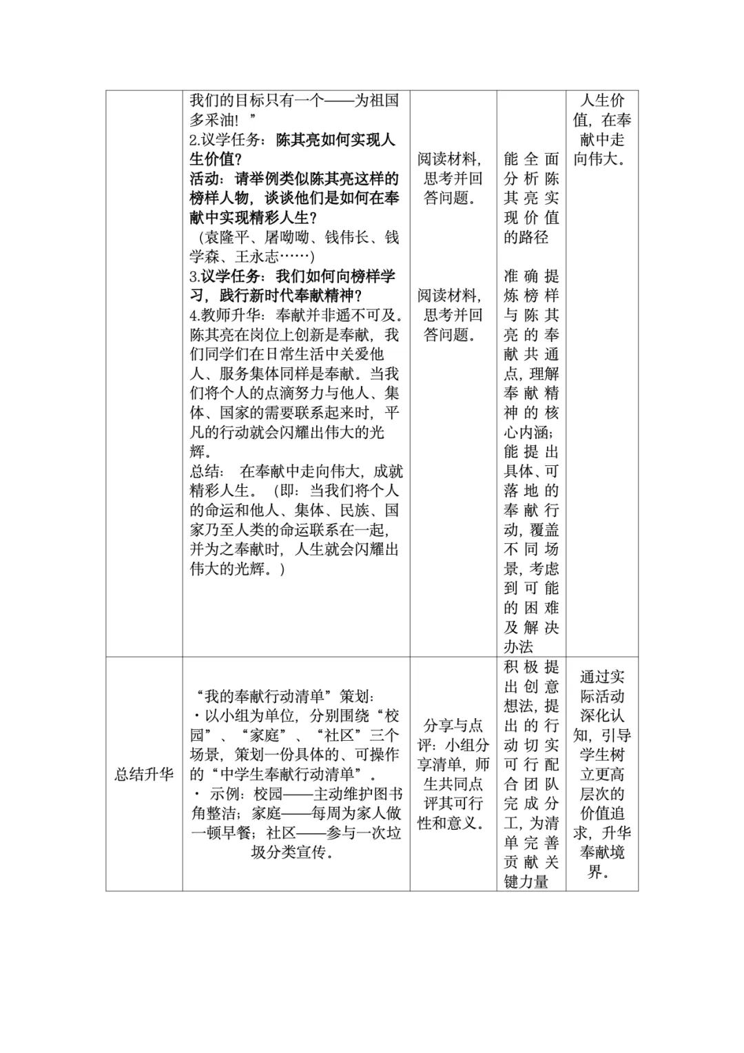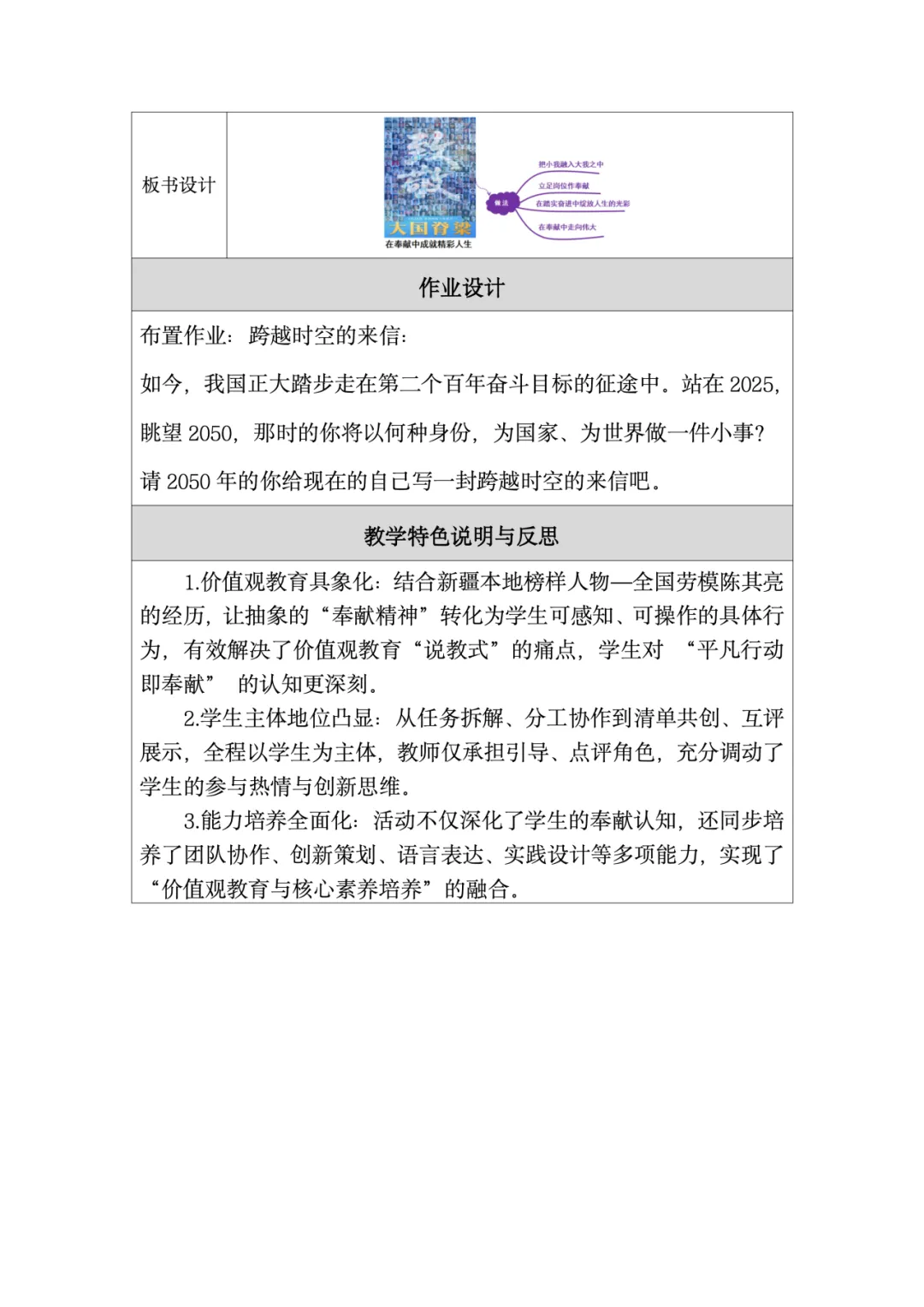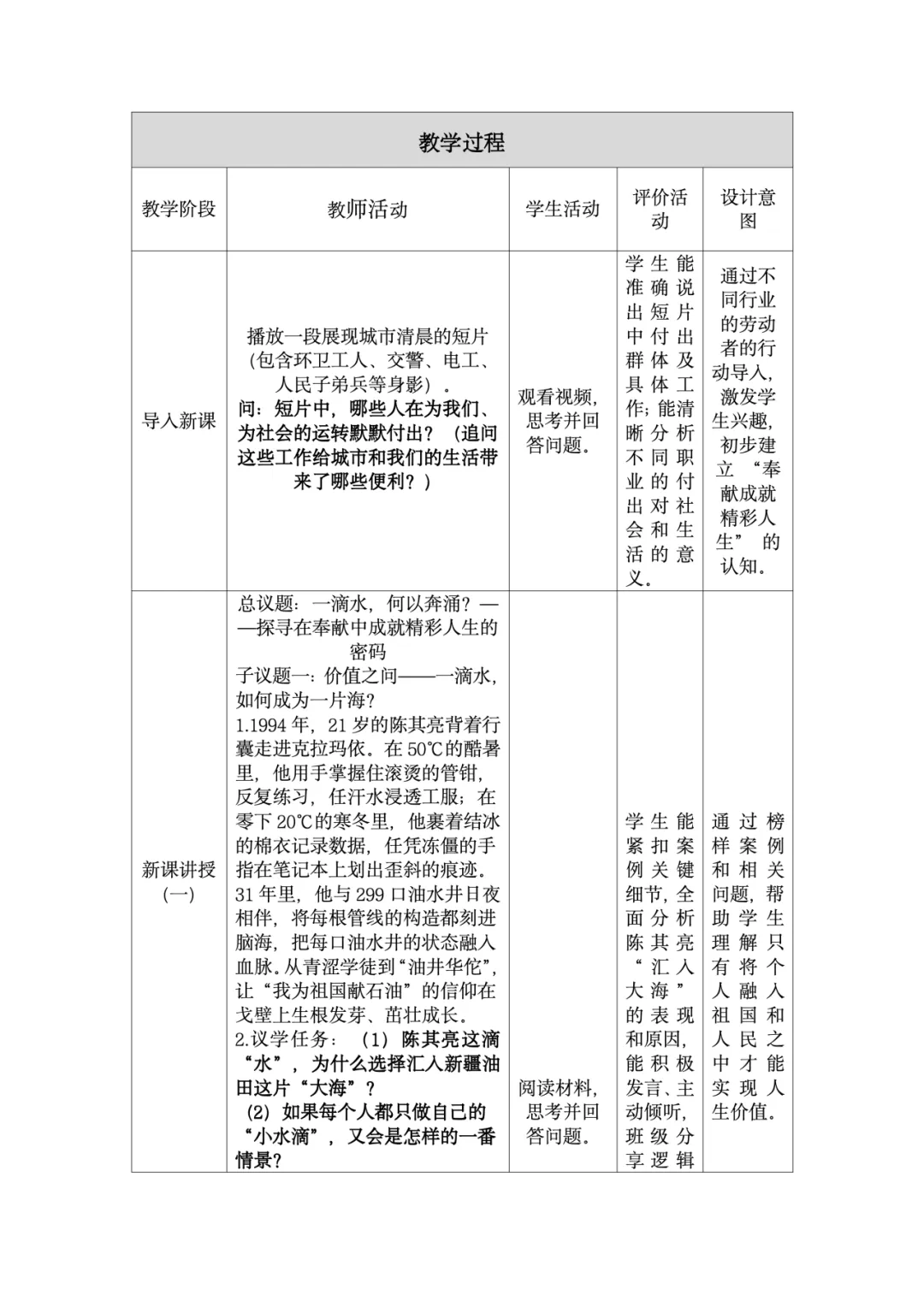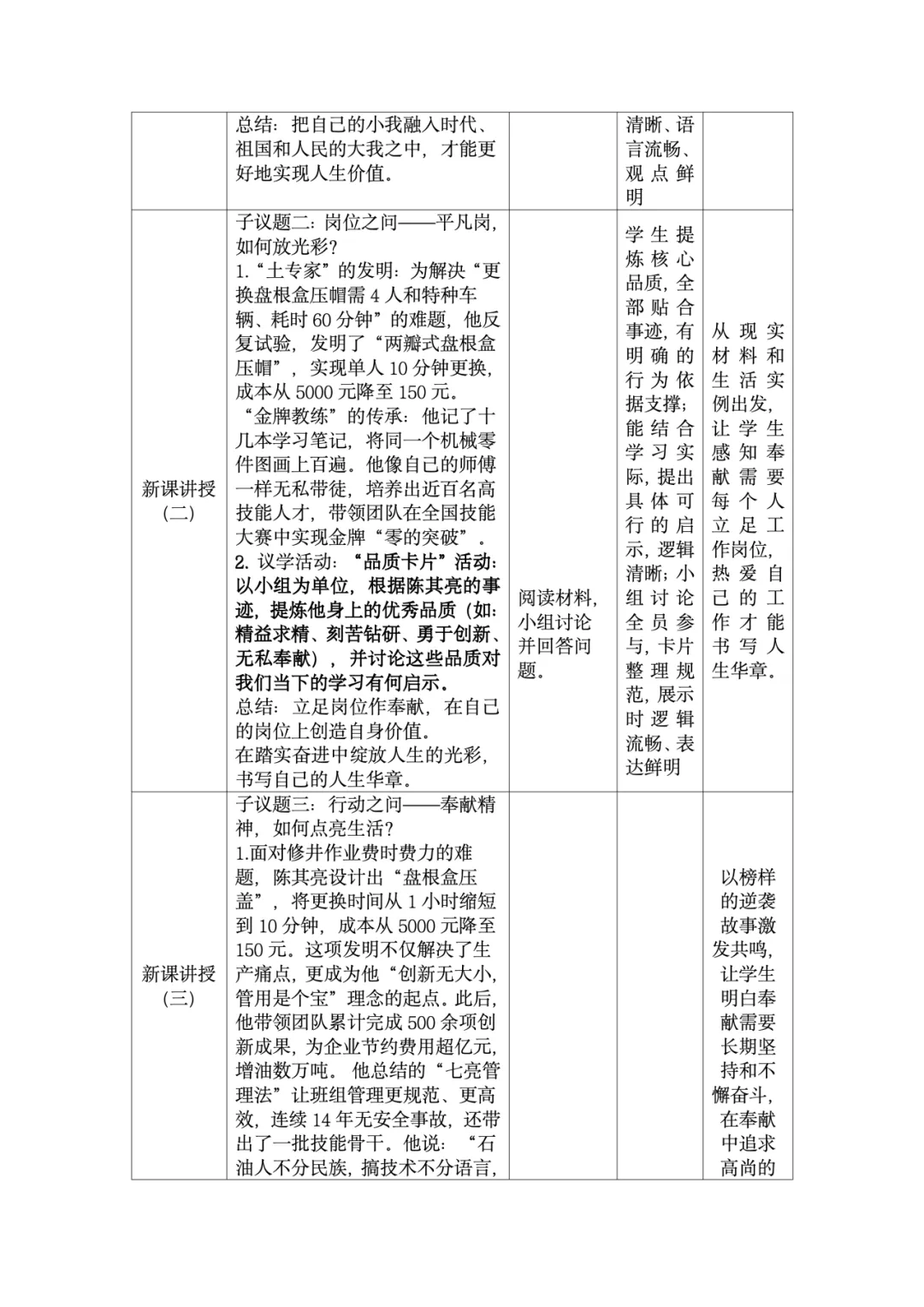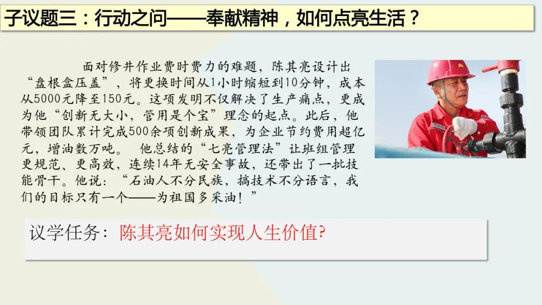 这份教学设计在利用本土化资源方面亮点突出。首先,以新疆本土全国劳模陈其亮31年扎根克拉玛依油田的真实事迹为核心,将抽象的“奉献精神”转化为学生可感知的榜样故事,使价值观教育具象化,增强了教学的亲和力。其次,围绕陈其亮的成长历程设计“价值之问”“岗位之问”“行动之问”三个递进议题,引导学生层层深入理解“小我融入大我”的人生价值,实现了本土资源与教学目标的深度融合。再者,教学设计通过导入城市劳动者短片、策划校园家庭社区“奉献行动清单”等贴近学生生活的情境创设,激发情感共鸣,让“奉献”成为可践行的日常行为。此外,运用视频、小组讨论等多种形式呈现本土案例,同步培养了学生的合作探究与创新实践能力。最后,将榜样奋斗与时代主题相呼应,引导学生思考个人与国家发展的联系,增强了教育的现实意义。总体而言,该设计以本土化资源为载体,有效达成了核心素养目标。