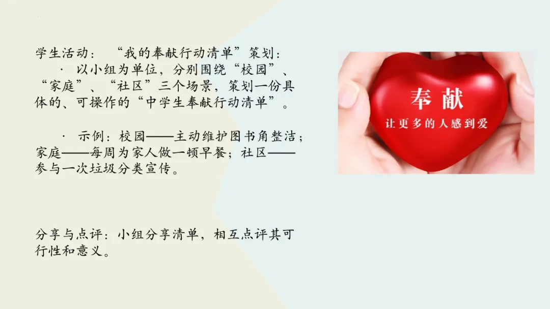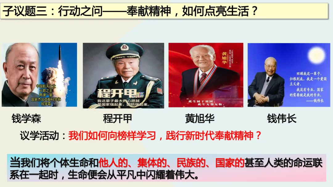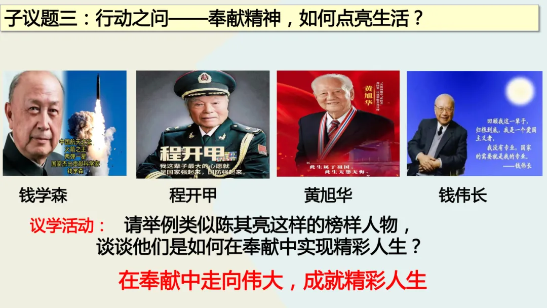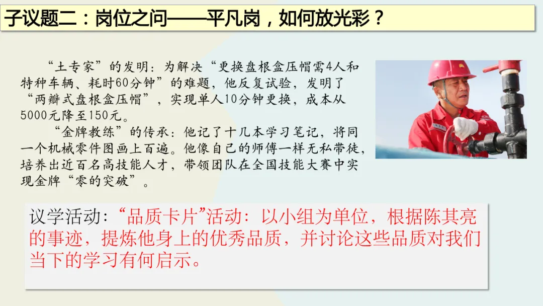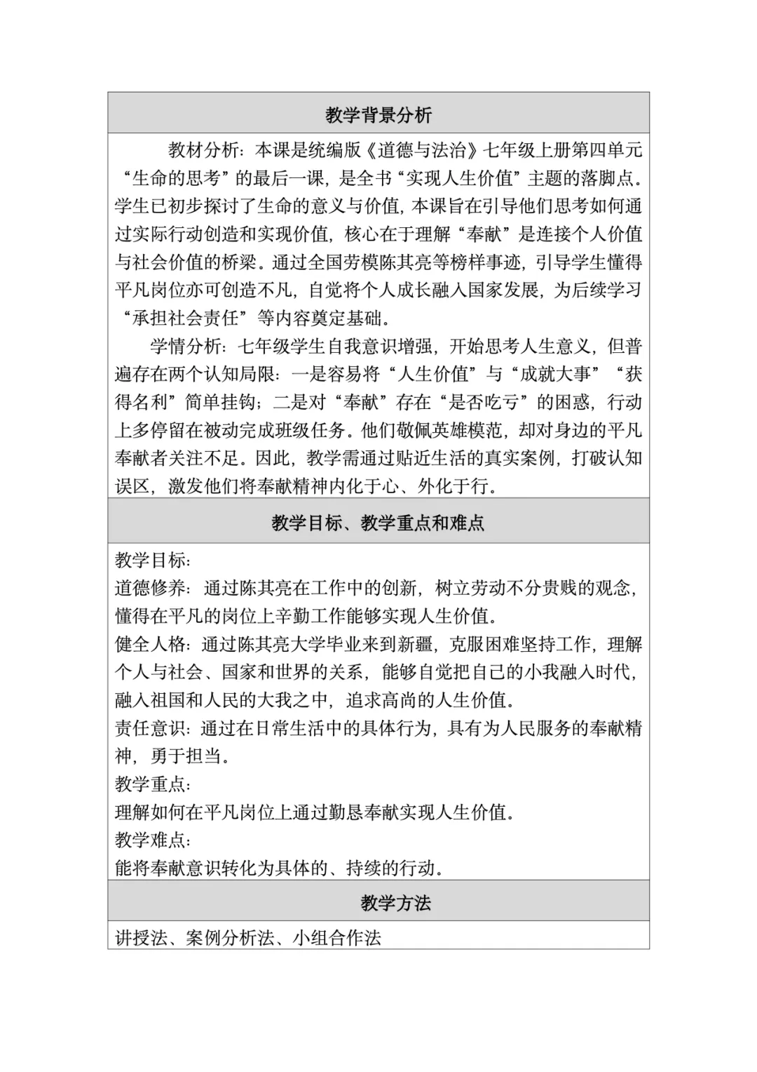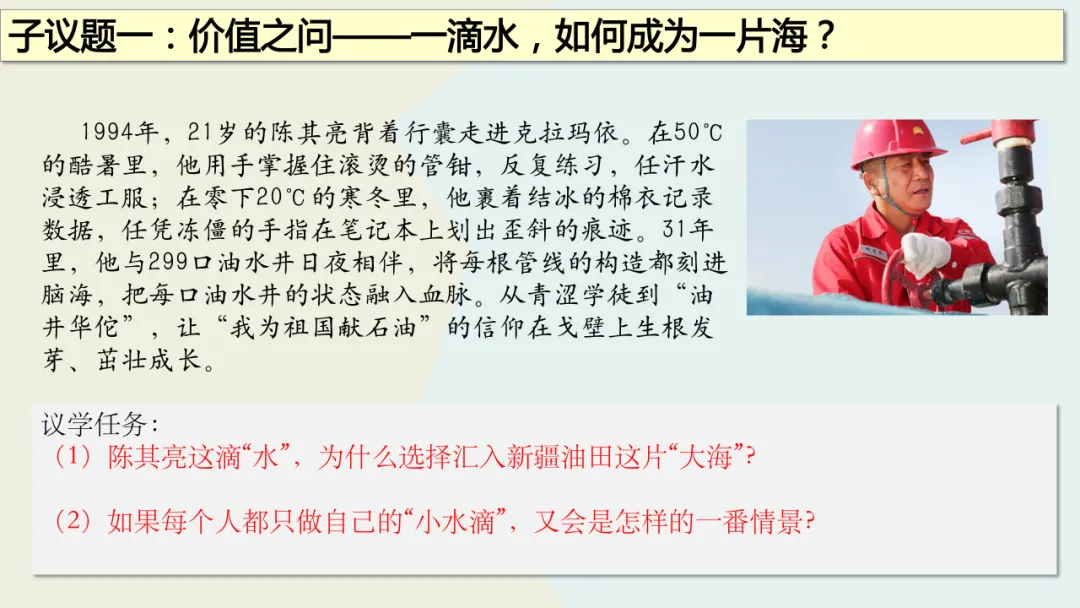 这份教学设计在利用本土化资源方面亮点突出。首先,以新疆本土全国劳模陈其亮31年扎根克拉玛依油田的真实事迹为核心,将抽象的“奉献精神”转化为学生可感知的榜样故事,使价值观教育具象化,增强了教学的亲和力。其次,围绕陈其亮的成长历程设计“价值之问”“岗位之问”“行动之问”三个递进议题,引导学生层层深入理解“小我融入大我”的人生价值,实现了本土资源与教学目标的深度融合。再者,教学设计通过导入城市劳动者短片、策划校园家庭社区“奉献行动清单”等贴近学生生活的情境创设,激发情感共鸣,让“奉献”成为可践行的日常行为。此外,运用视频、小组讨论等多种形式呈现本土案例,同步培养了学生的合作探究与创新实践能力。最后,将榜样奋斗与时代主题相呼应,引导学生思考个人与国家发展的联系,增强了教育的现实意义。总体而言,该设计以本土化资源为载体,有效达成了核心素养目标。