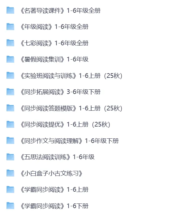 当前位置:首页>小学资源包>小学语文《阅读类》资源合集 1-6年级上下册(网盘打包下载)名著导读+拓展阅读+快乐读书吧+同步阅读