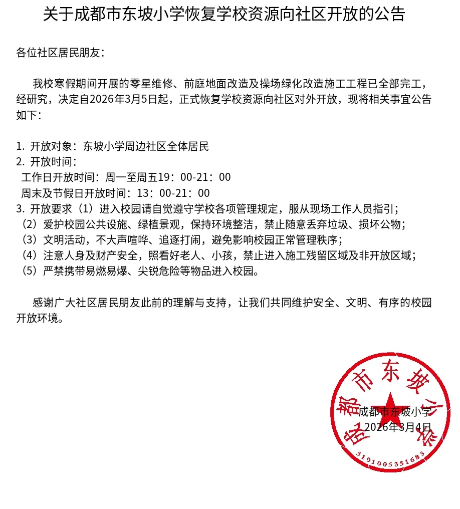 关于成都市东坡小学恢复学校资源向社区开放的公告