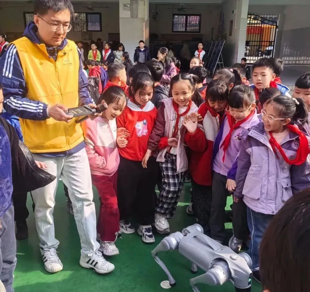 本次活动的一大亮点,是智能机器狗带来的精彩展演。科技工作人员现场操控机器狗完成站立、行走、转身、跳跃、鞠躬等高难度动作,灵活敏捷的姿态、精准稳定的操控,引得在场师生阵阵欢呼与掌声。同学们近距离观察机器狗的运行原理,直观感受人工智能与机械科技的融合发展,进一步激发了他们对前沿科技的浓厚兴趣。