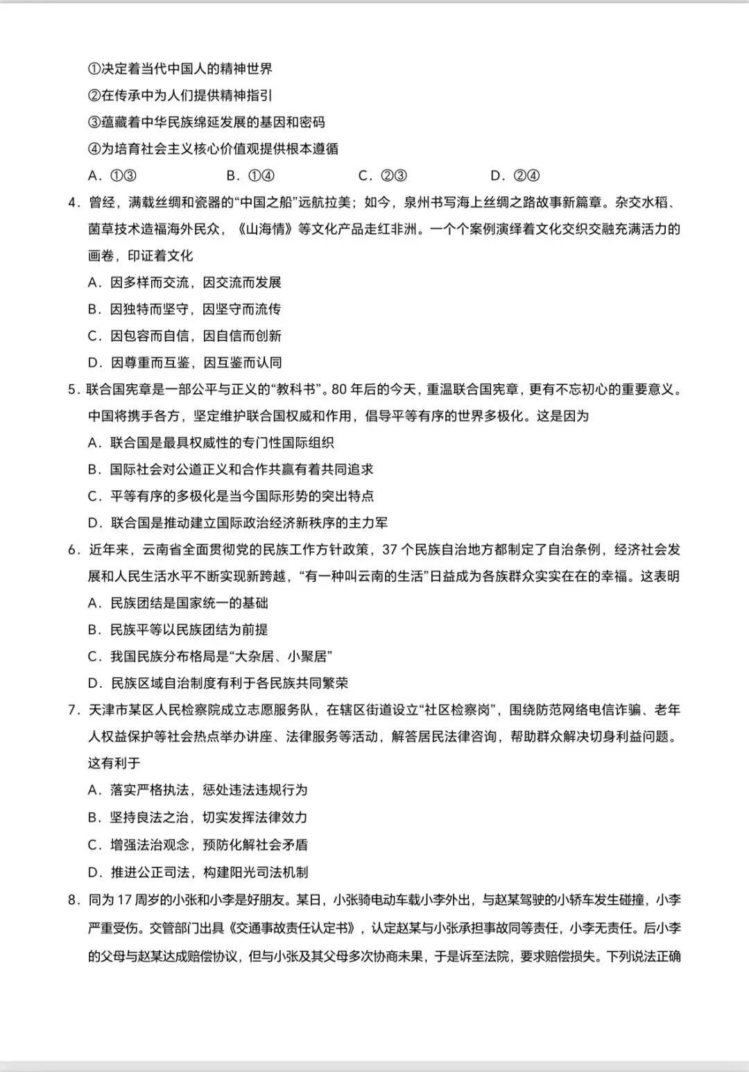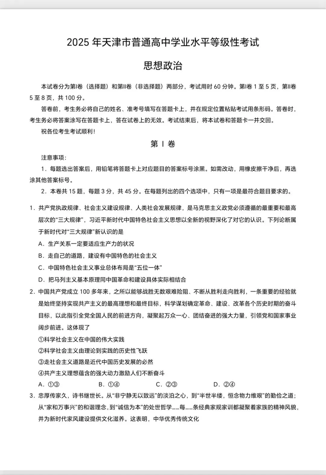 今日分享的试卷:天津市 2025 年普通高中学业水平等级性考试(思想政治)及官方解析