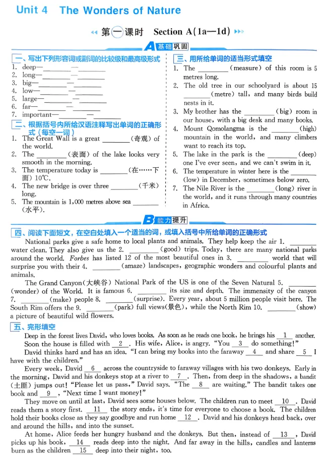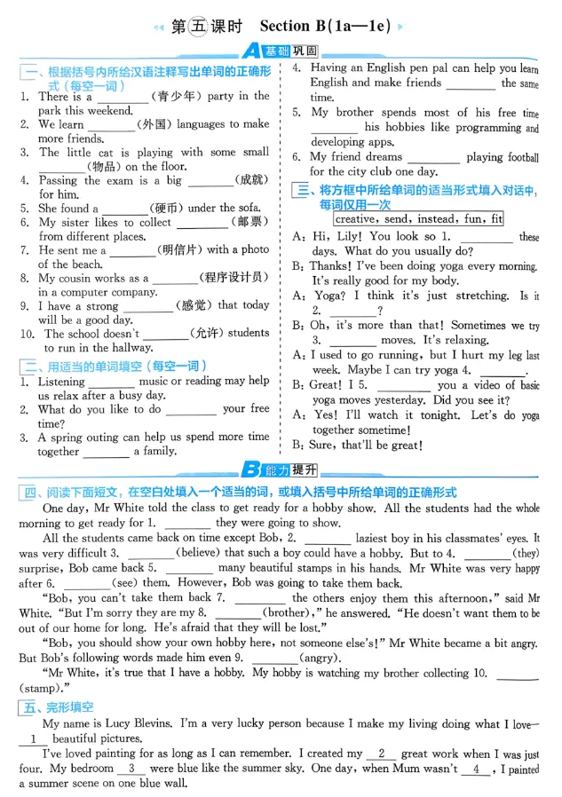 ● 分层训练,循序渐进:练习设计遵循由浅入深的原则,从单词拼写、句型转换等基础题型入手,逐步过渡到完形填空、阅读理解等能力提升题,满足不同层次学生的学习需求。