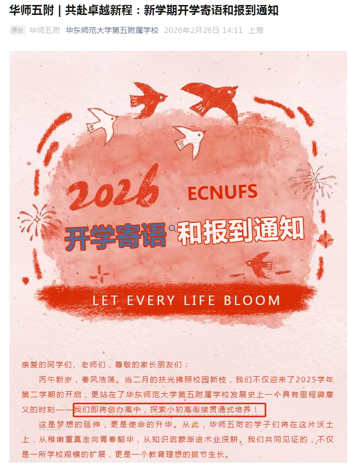 华东师范大学第五附属学校在官微上宣布,即将创办高中。