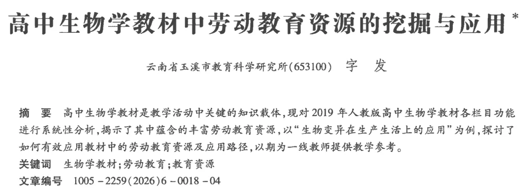 | 本文来自字发.高中生物学教材中劳动教育资源的挖掘与应用[J].中学生物教学,2026,(06):18-21。