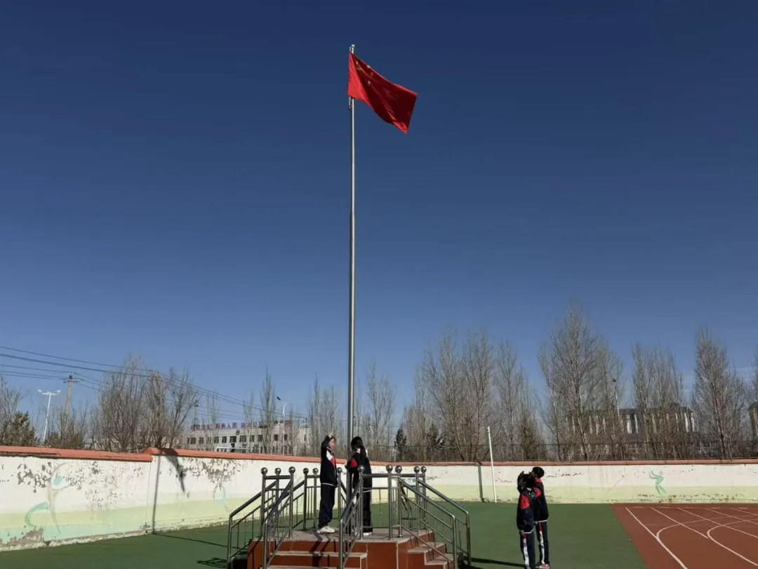 伴随着庄严的旋律,五星红旗冉冉升起,全体师生肃立注目,行礼致敬。