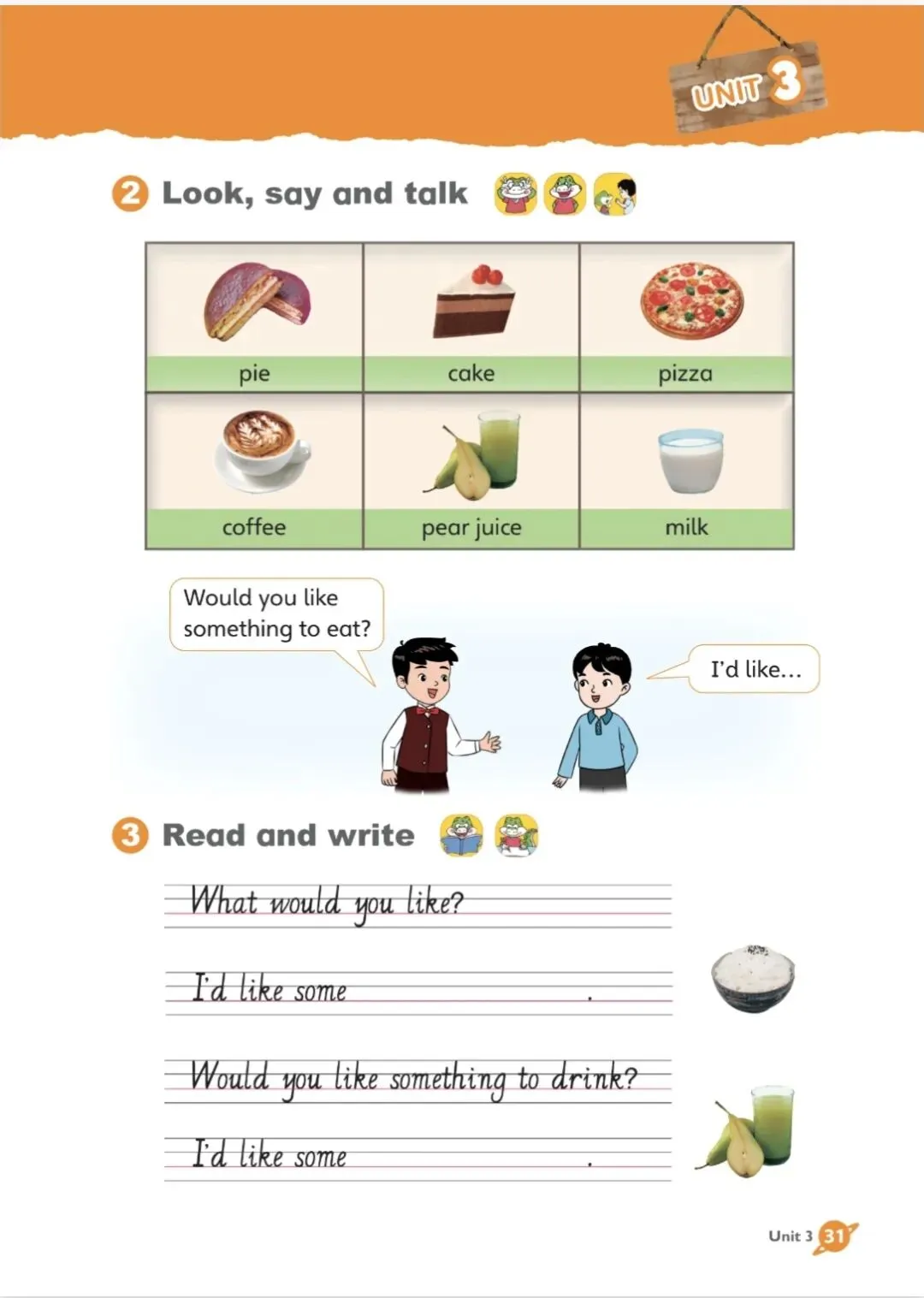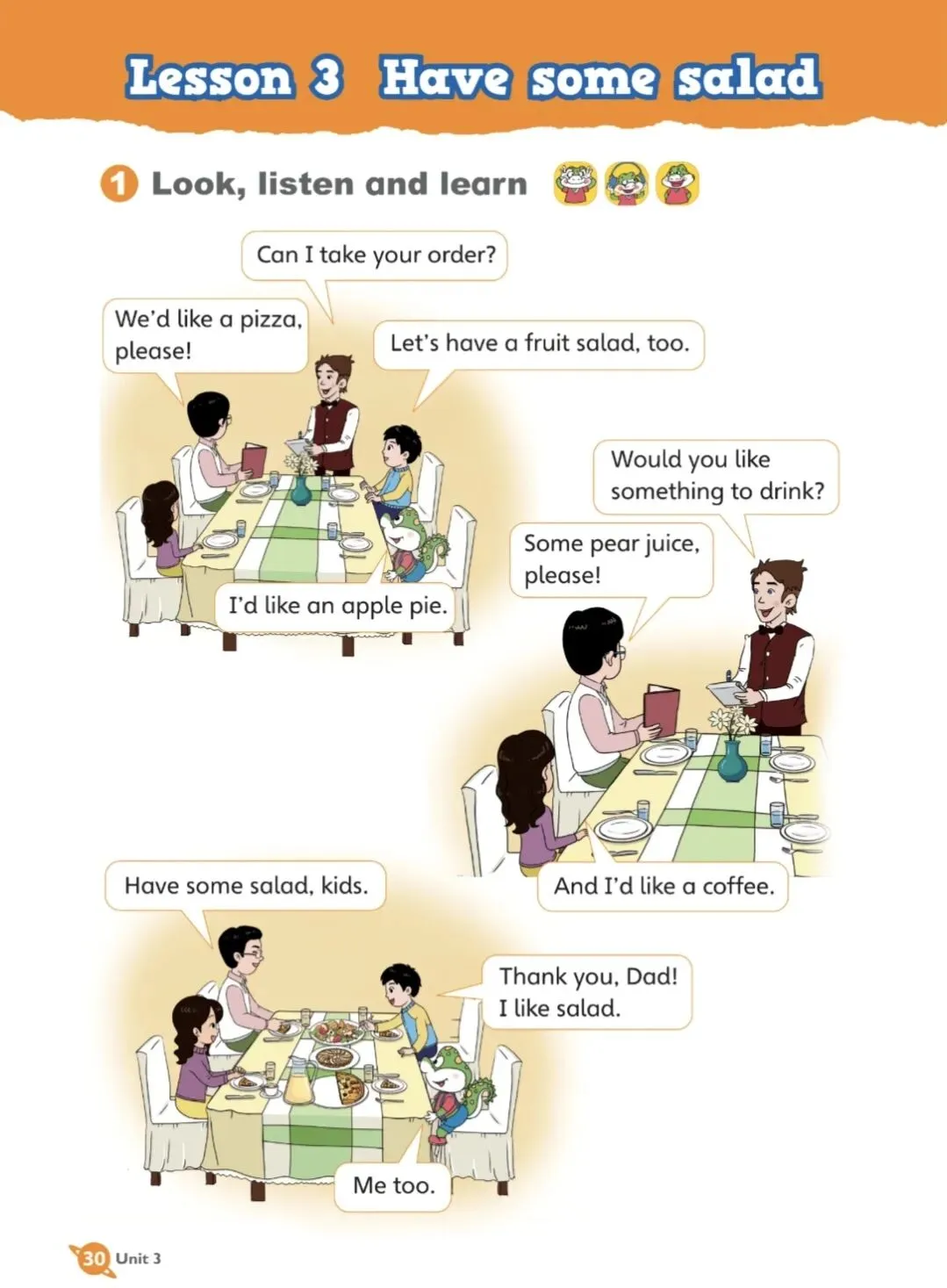 Lesson 3 Have some salad 第三课 来点沙拉吧①Look, listen and learn 看一看,听一听,学一学Can I take your order? 请问可以点餐了吗?We'd like a pizza, please! 我们想要一个披萨!Let's have a fruit salad, too. 我们还要一份水果沙拉。I'd like an apple pie. 我想要一个苹果派。Would you like something to drink? 你们想要喝点什么吗?Some pear juice, please! 请给我们一些梨汁!And I'd like a coffee. 我想要一杯咖啡。Have some salad, kids. 孩子们,吃点沙拉吧。Thank you, Dad! I like salad. 谢谢爸爸!我喜欢沙拉。②Look, say and talk 看一看,说一说,聊一聊pie 派;cake 蛋糕;pizza 披萨;coffee 咖啡;pear juice 梨汁;milk 牛奶Would you like something to eat? 你想要吃点什么吗?What would you like? 你想要点什么?I'd like some(rice).我想要一些(米饭)。Would you like something to drink? 你想要喝点什么吗?I'd like some (pear juice). 我想要一些(梨汁)。免责声明:本音频、视频和相关素材来源于网络,仅供学习者免费使用,版权归原作者所有,如有侵权请联系删除!