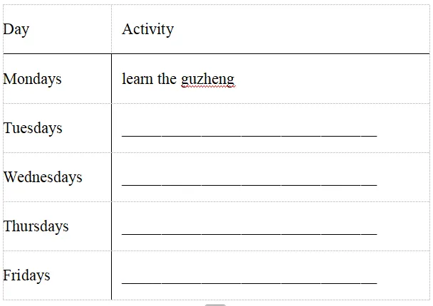 (3)每项活动标注星期和活动名称,如:Monday: kung fu。