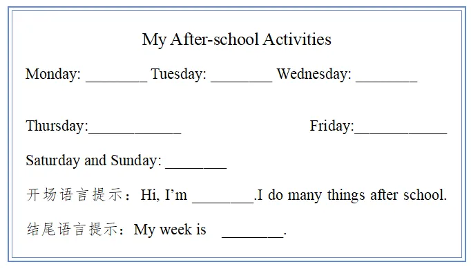 Hello,I’m John.I do many activities during the week.On Mondays,I usually learn the flute after school. I learn Beijing Opera on Tuesdays and Wednesdays.It’s fun.On Thursdays,I learn art.I like painting .On Fridays,I play badminton with my friends.On Saturdays,I usually play in the park with my family.On Sundays,I stay at home.