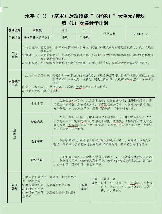 本课以健康第一、趣味导学为原则,立足三年级学生身心发展特点,通过游戏化、情境化、生活化的练习方式,发展学生身体柔韧性与灵敏性,培养运动兴趣,提升基本运动能力,为后续技能学习奠定坚实基础。
