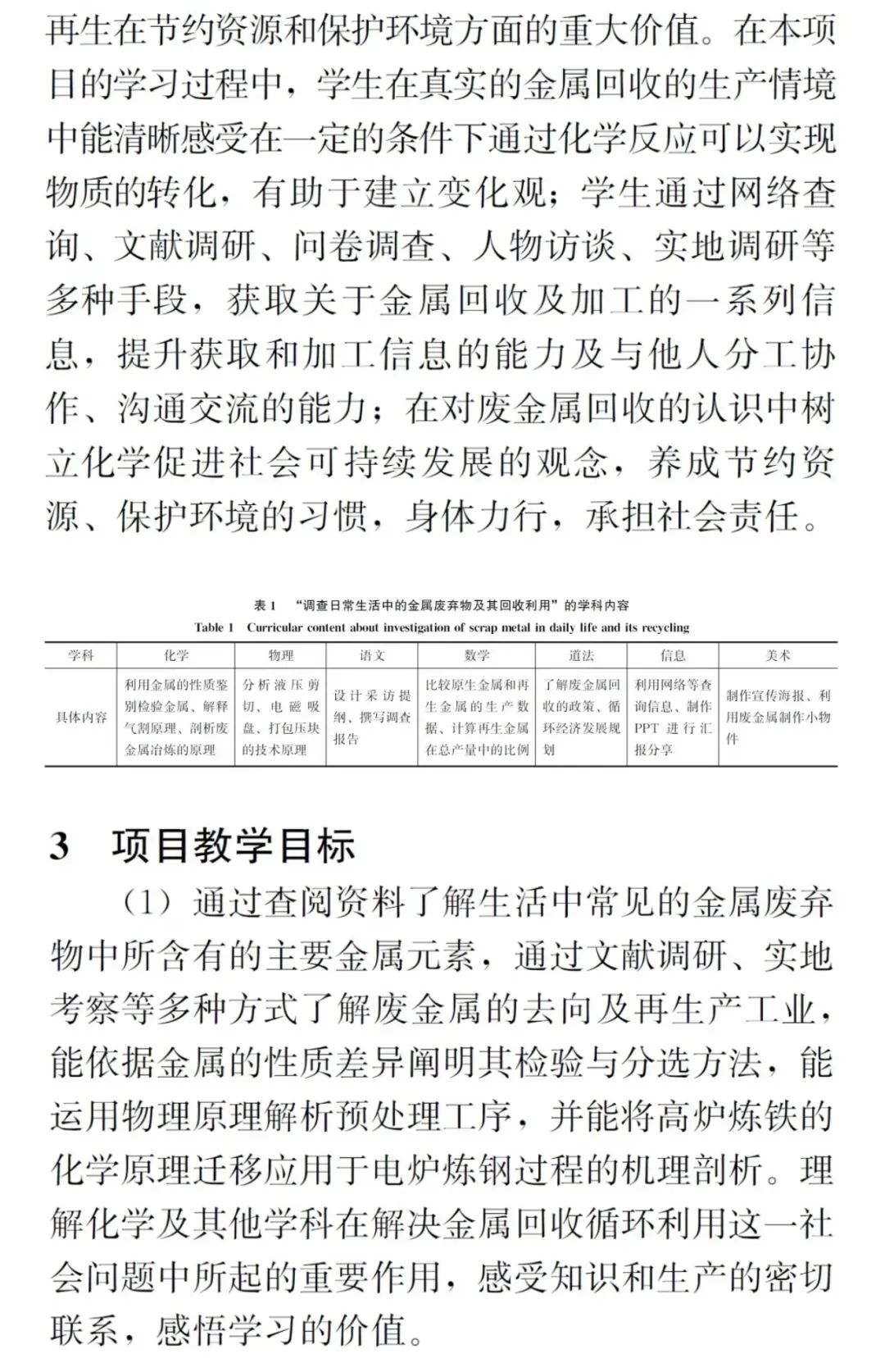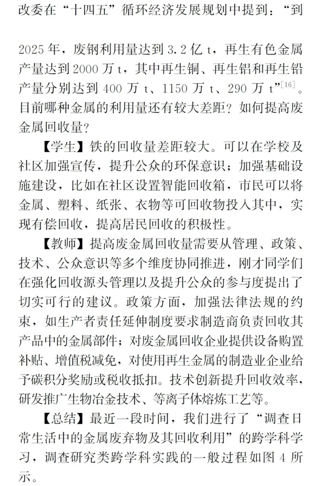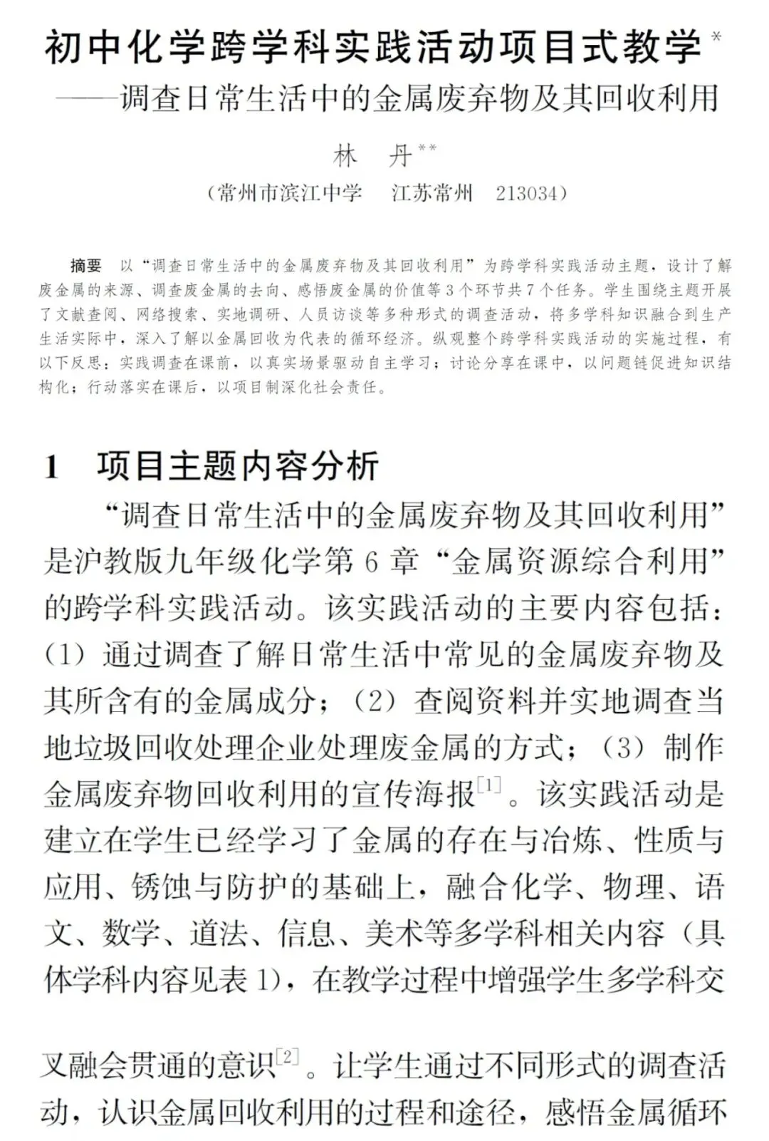 林丹.初中化学跨学科实践活动项目式教学——调查日常生活中的金属废弃物及其回收利用[J].化学教育(中英文),2026,47(05):30-38.