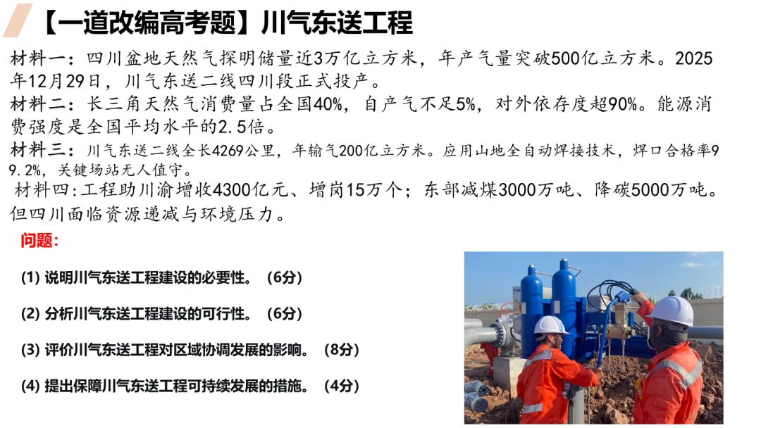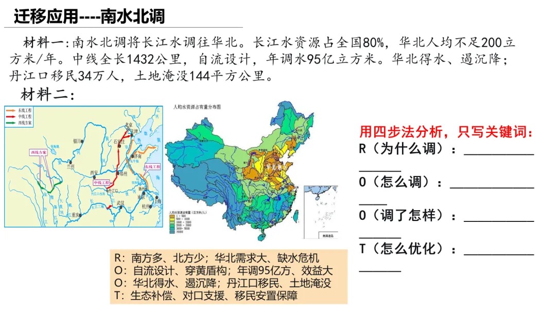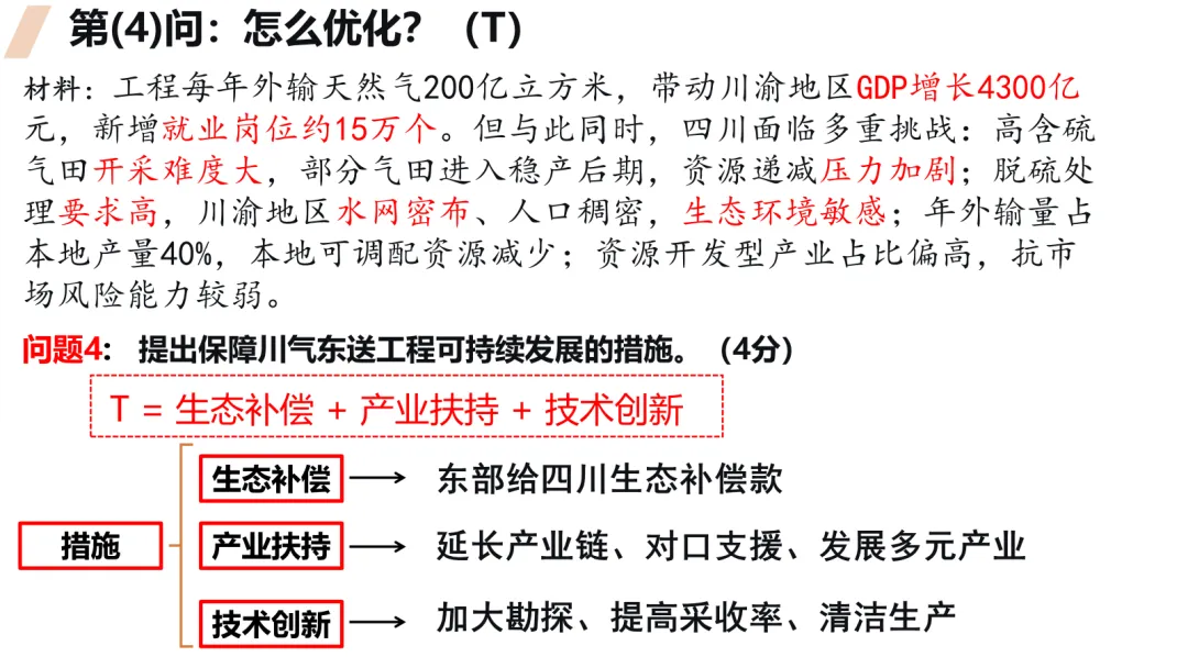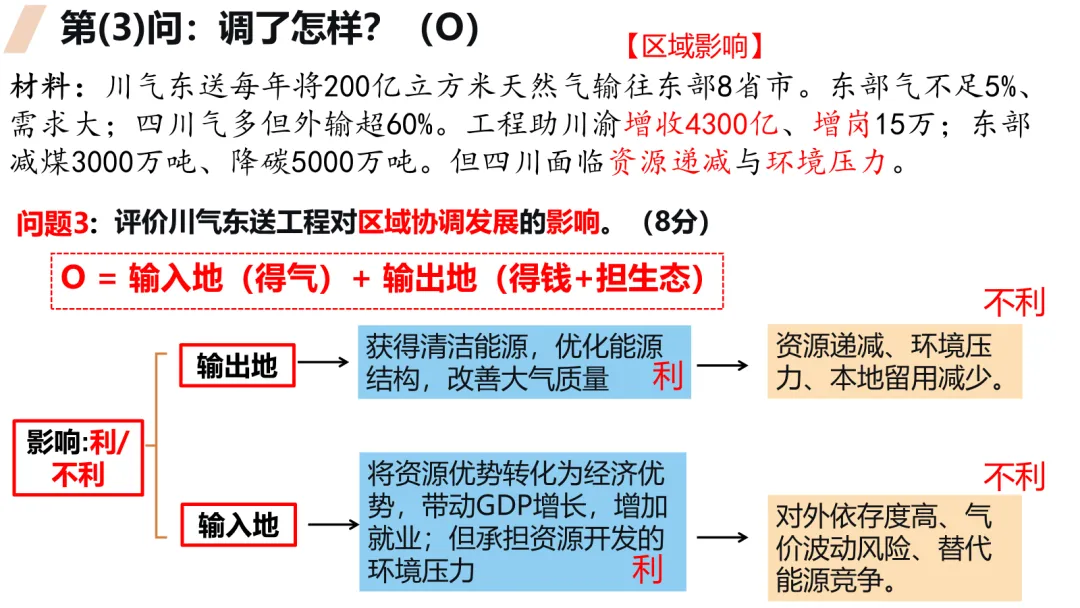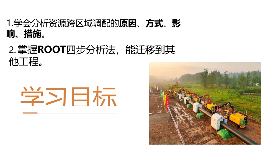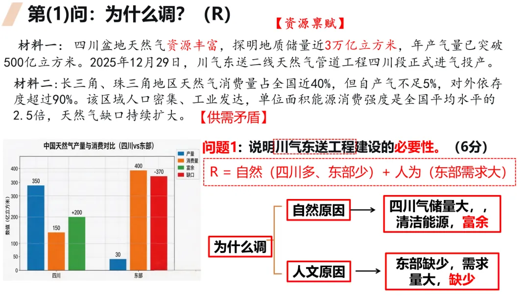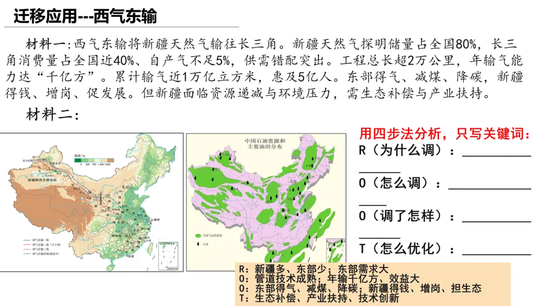本课以川气东送工程为案例,通过四步分析法(原因、方式、影响、措施)引导学生掌握资源跨区域调配的答题思维。课堂以高考改编题为主线,学生独立作答、小组讨论、迁移训练环环相扣。ROOT模型隐性支撑,西气东输、南水北调迁移验证。