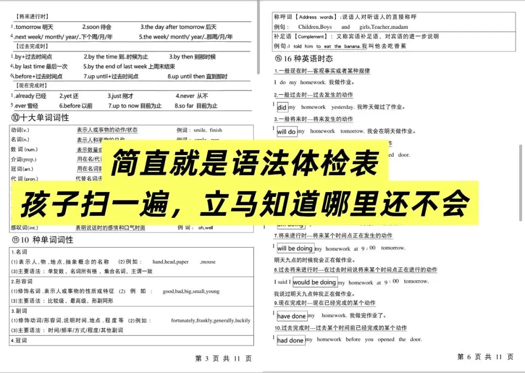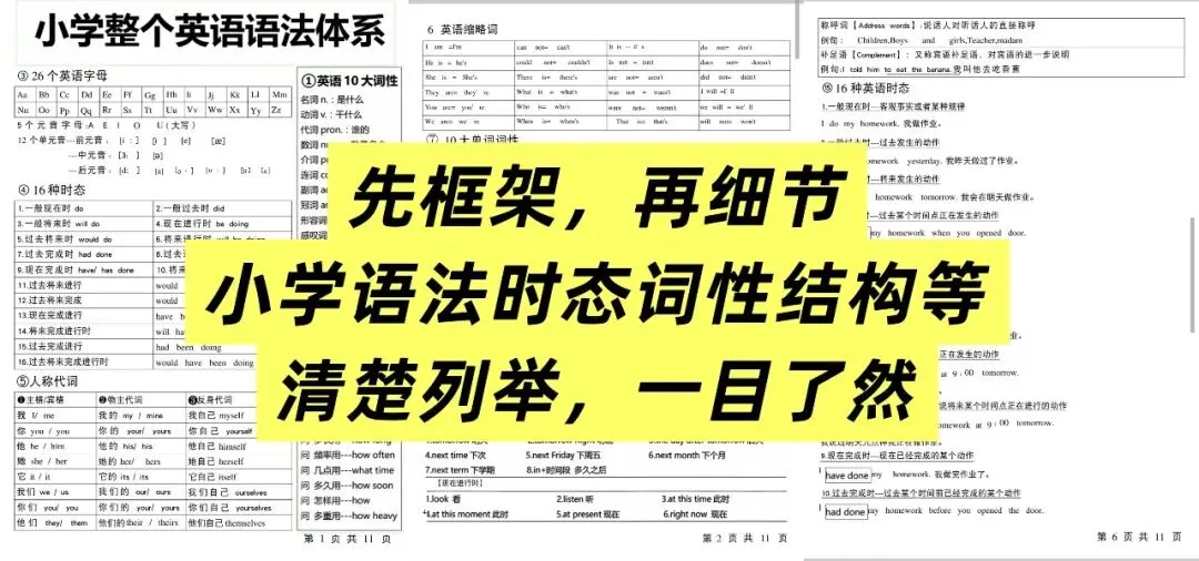 所以,手手君今天分享给大家一个好资源《小学英语语法一览表》,把小学阶段必须掌握的英语语法知识点,全部梳理清楚,浓缩成这几页纸