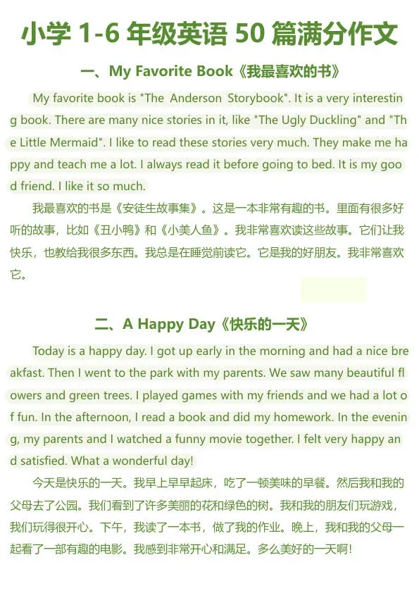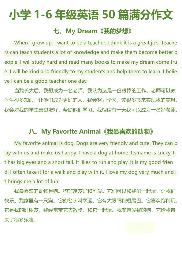 今天分享的是《小学英语50篇满分作文》。无论是词汇、句式、短语,还是连词的运用,均堪称经典范例。学生只需模仿写作,即可在考试中获得高分。