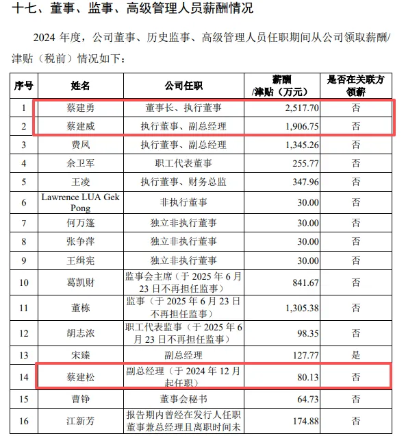 更受关注的是,蔡建勇的两位兄弟均为初中学历。其中蔡建威从力勤资源领取的税前2024年薪酬1906.75万元;蔡建松2024年12月起任副总经理,任职不足一月即获薪酬80.13万元,折算年薪近千万。