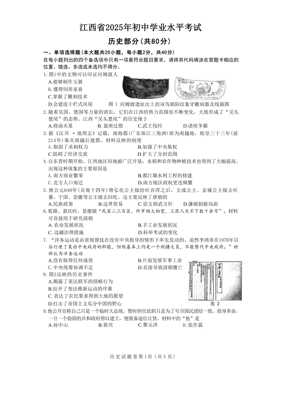 试题资源 | 2025年江西省初中学业水平考试历史试题
