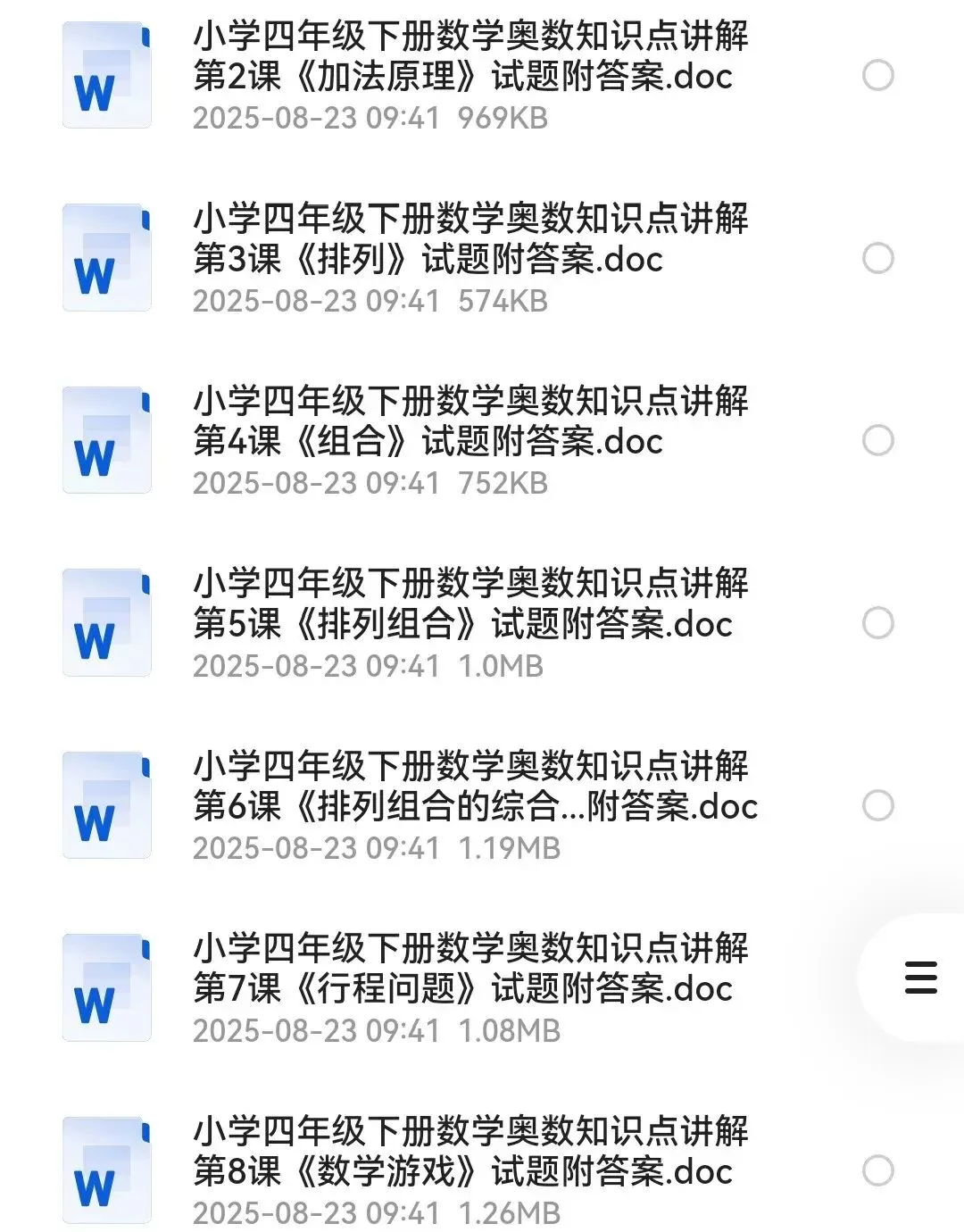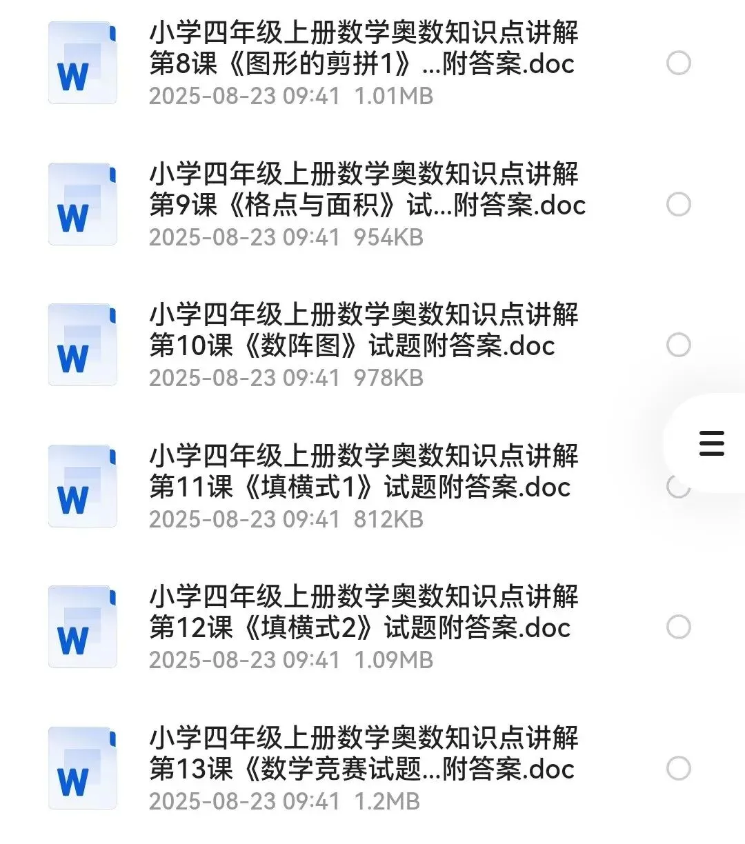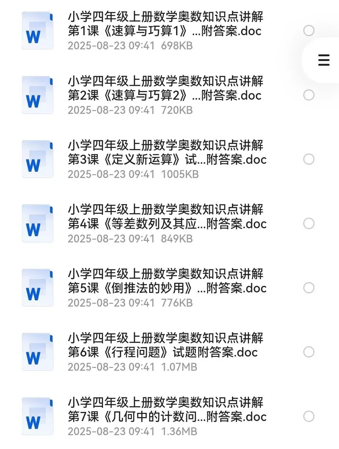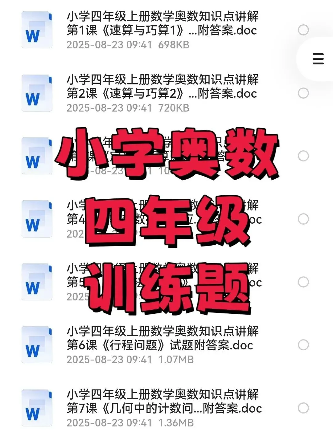 小学四年级数学奥数知识点讲解,上册+下册全套26课资料获取说明资料获取请添加小编微信:fyl51368;所有资料会收取5-9.9元资料整理费。内容声明本微信公众账号分享的资源均通过网络等公共合法渠道获得,仅供试用!版权归原作者或原出版机构所有,本资源为电子载体,分享仅限于家庭使用与交流学习心得、参考和辅助购买决策,不得以任何理由在商业行为中使用。如有侵权,请及时联系删除。